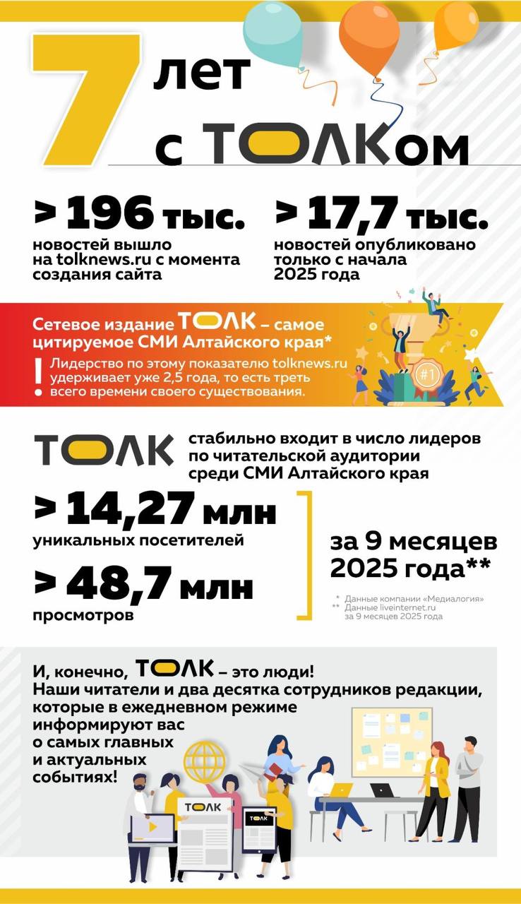 За эти годы мы не только встали на ноги, но и вырвались в топ лидеров среди СМИ Алтайского края по целому ряду ключевых показателей. Мы опубликовали 196 тысяч новостей, более 17 тысяч из них с начала 2025 года. Важно, что за последние девять месяцев наш сайт посетили почти 15 миллионов читателей. А это значит, что мы не зря делаем свою работу.