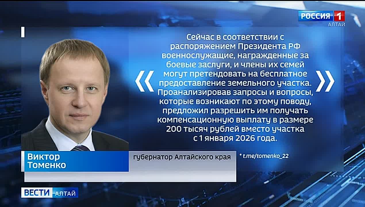 В Алтайском крае военнослужащие, награждённые за боевые заслуги, и члены их семей должны иметь возможность получать компенсационную выплату в размере 200 тысяч рублей вместо земельного участка. С таким предложением сегодня выступил глава региона Виктор Томенко.