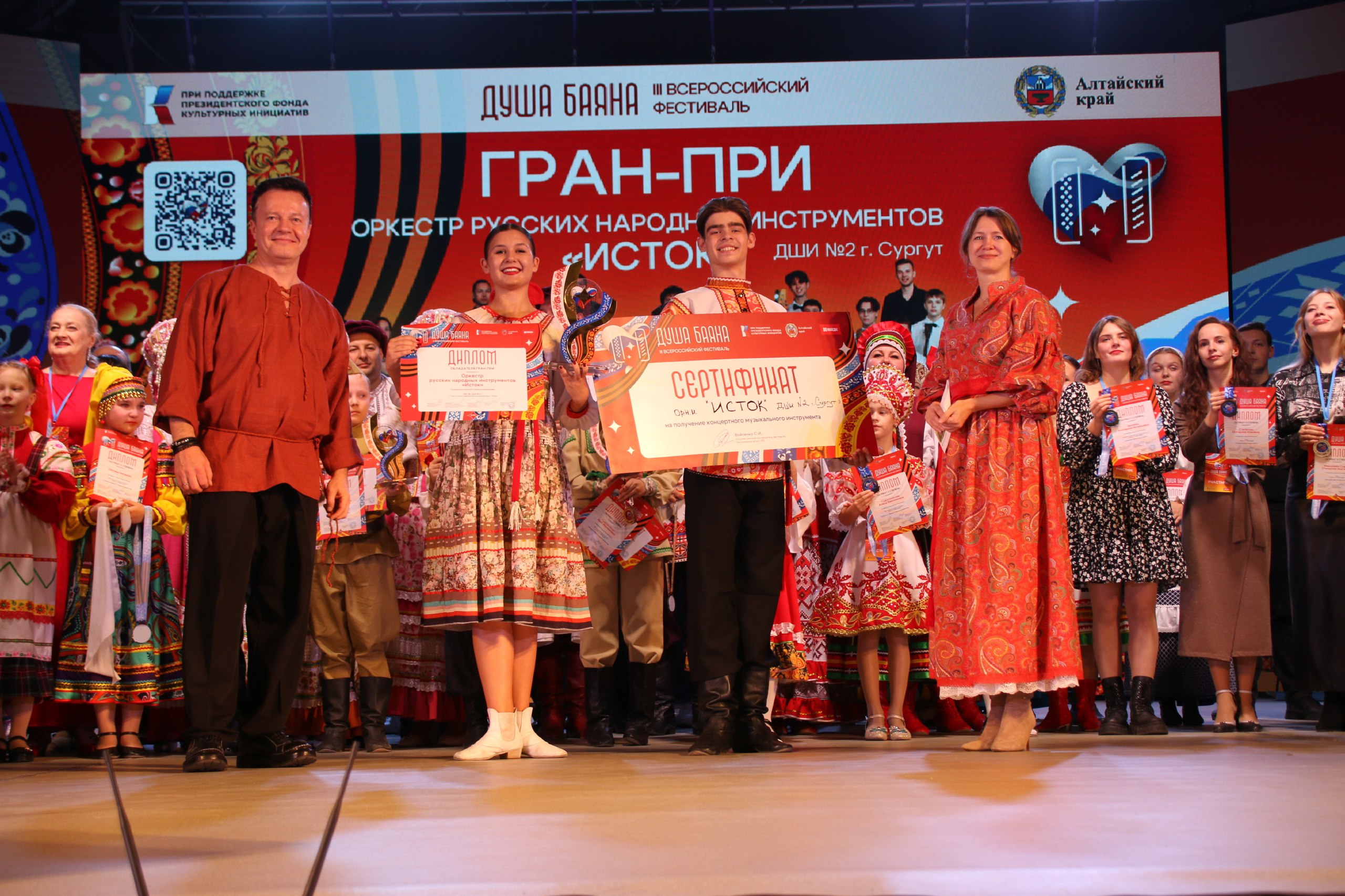 Для объявления гран-при фестиваля на сцену пригласили Министра культуры Алтайского края Елену Безрукову. В этом году главный приз – баян, а именно сертификат на изготовление инструмента, получил оркестр русских народных инструментов "Исток" (ДШИ №2 г. Сургут).