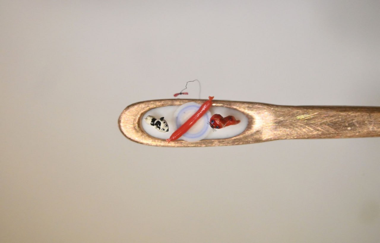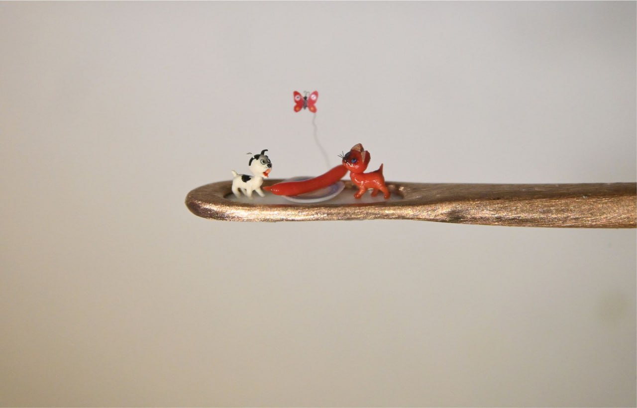 Владимир Анискин воссоздал сцену из мультфильма "Котенок Гав" в игольном ушке: там изображены Котенок Гав и щенок Шарик рядом с тарелкой, на которой лежит сосиска. Фигурки высотой 1 мм, а бабочка – всего 0,4 мм.