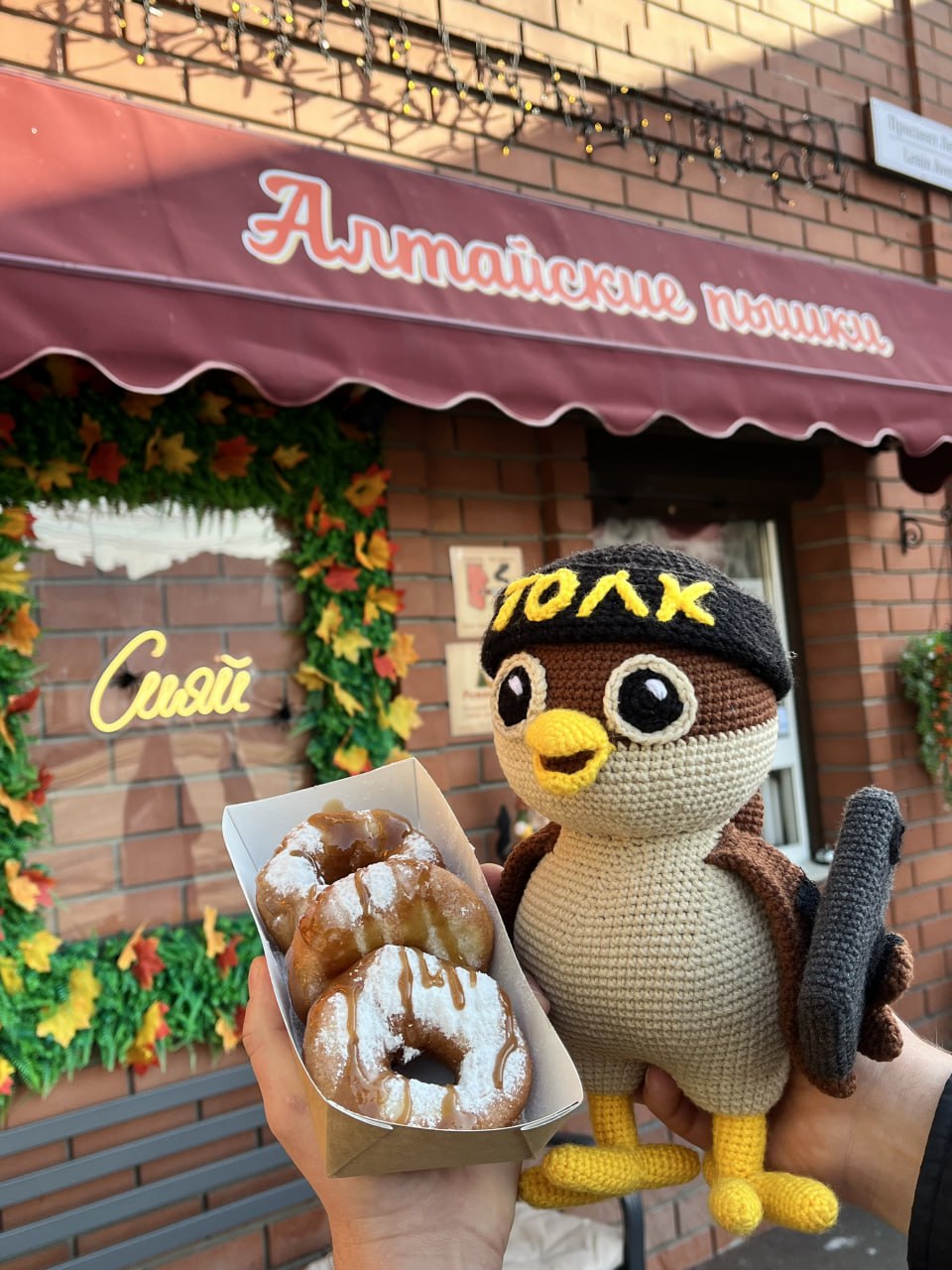 Одним осенним утром, пролетая над сонным городом, он учуял запах румяной выпечки. Толик сделал круг, потом второй — и через минуту он уже сидел на вывеске «Алтайских пышек» и заглядывал в окно. "Вот она – горячая новость"! — сказал Толик.