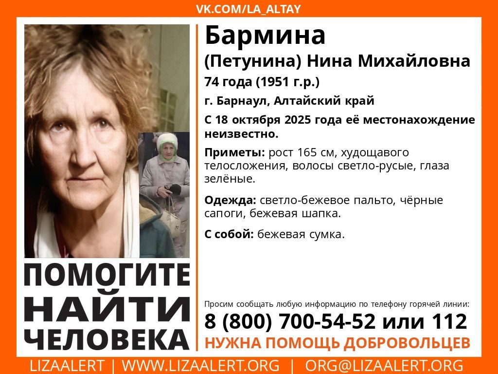 Поиски Нины Барминой продолжаются уже пять дней. Известно, что с собой женщина взяла бежевую сумку. Одежда — светло-бежевое пальто, чёрные сапоги и бежевая шапка.