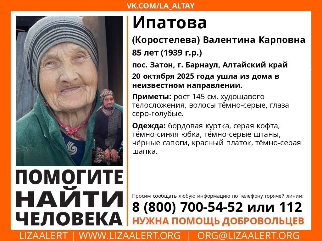 Валентину Карпову ищут с 20 октября. 85-летняя пенсионерка была одета в бордовую куртку, серую кофту, темно-синюю юбку и такого же цвета штаны. Также на ней были черные сапоги, красный платок и темно-серая шапка.