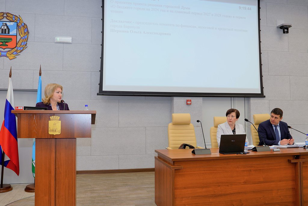 По приглашению депутатов, с докладом по проекту бюджета города на 2026 год и на плановый период 2027 и 2028 годов выступила председатель комитета по финансам, налоговой и кредитной политике города Барнаула Ольга Шернина. Напомним, на октябрьском заседании Думы документ будет рассматриваться в первом чтении.