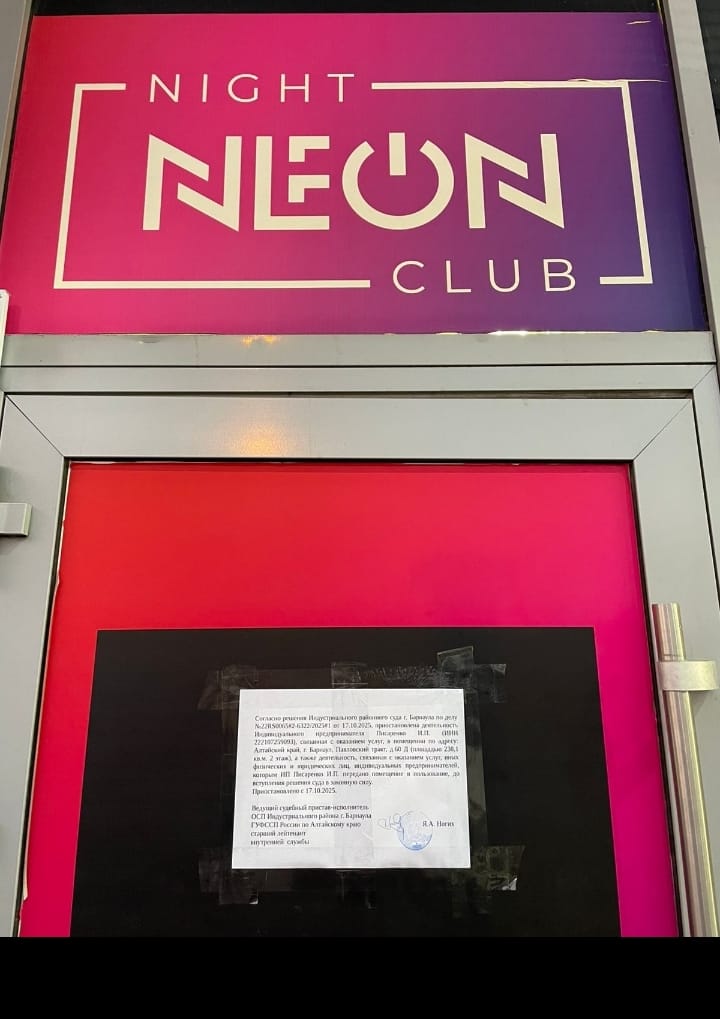 С целью устранения предпринимателем нарушений Индустриальный районный суд приостановил деятельность клуба «NEON». Помещение площадью 238, 1 кв. м, включая танцпор, бар и зоны отдыха, опечатали, сообщает региональное Управление службы судебных приставов.