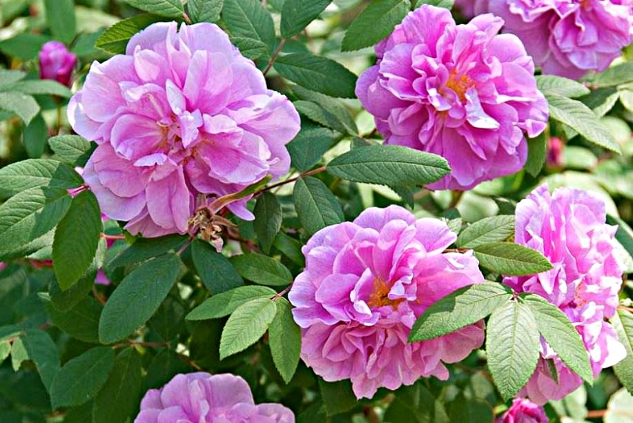 - Рубра: Куст с мощными колючками и крупными цветами, от розовых до пурпурных тонов, источающий нежный аромат.