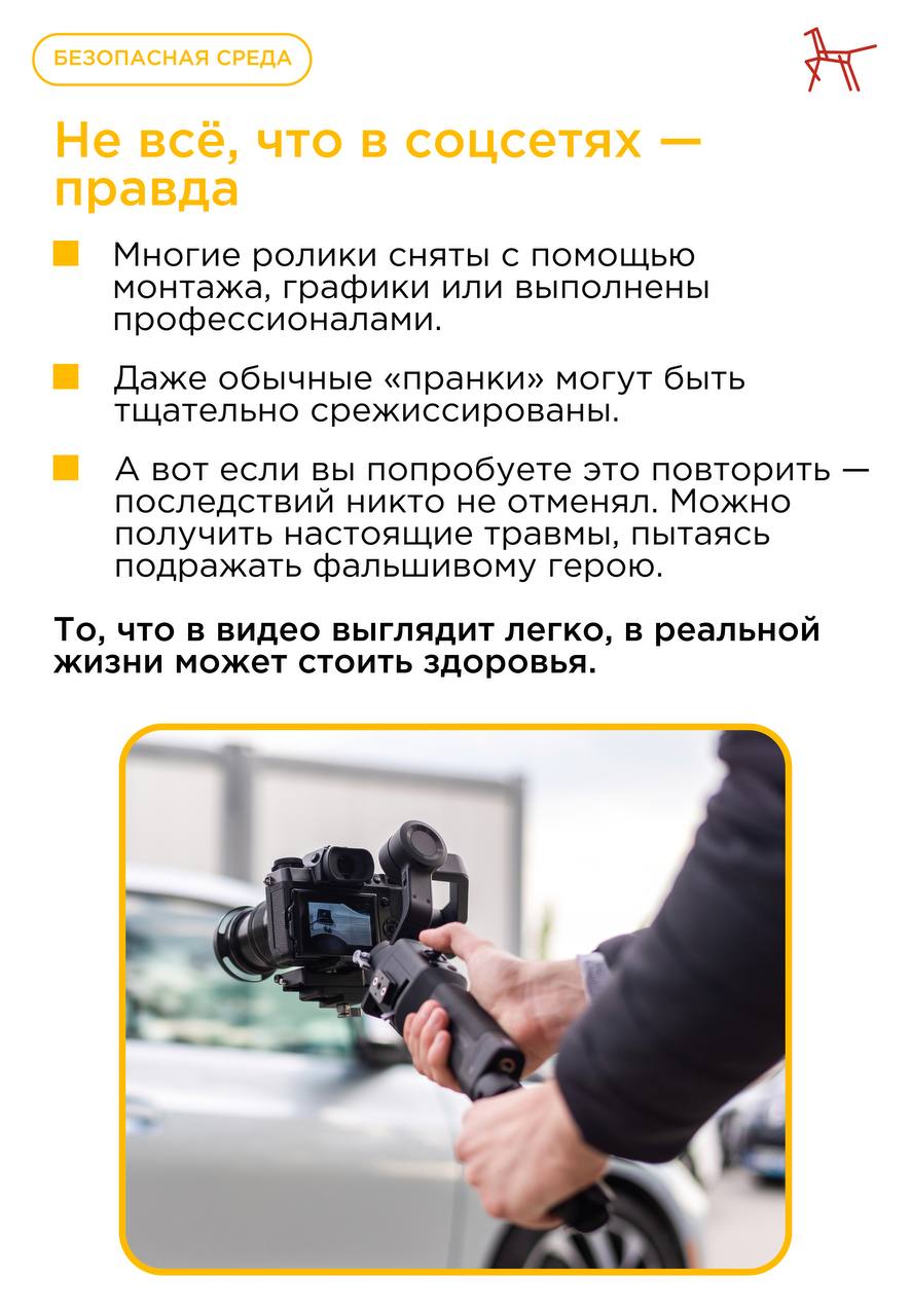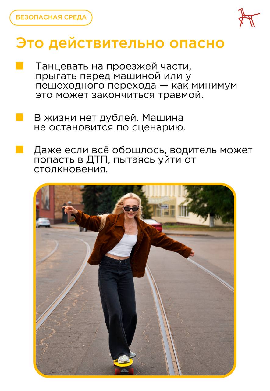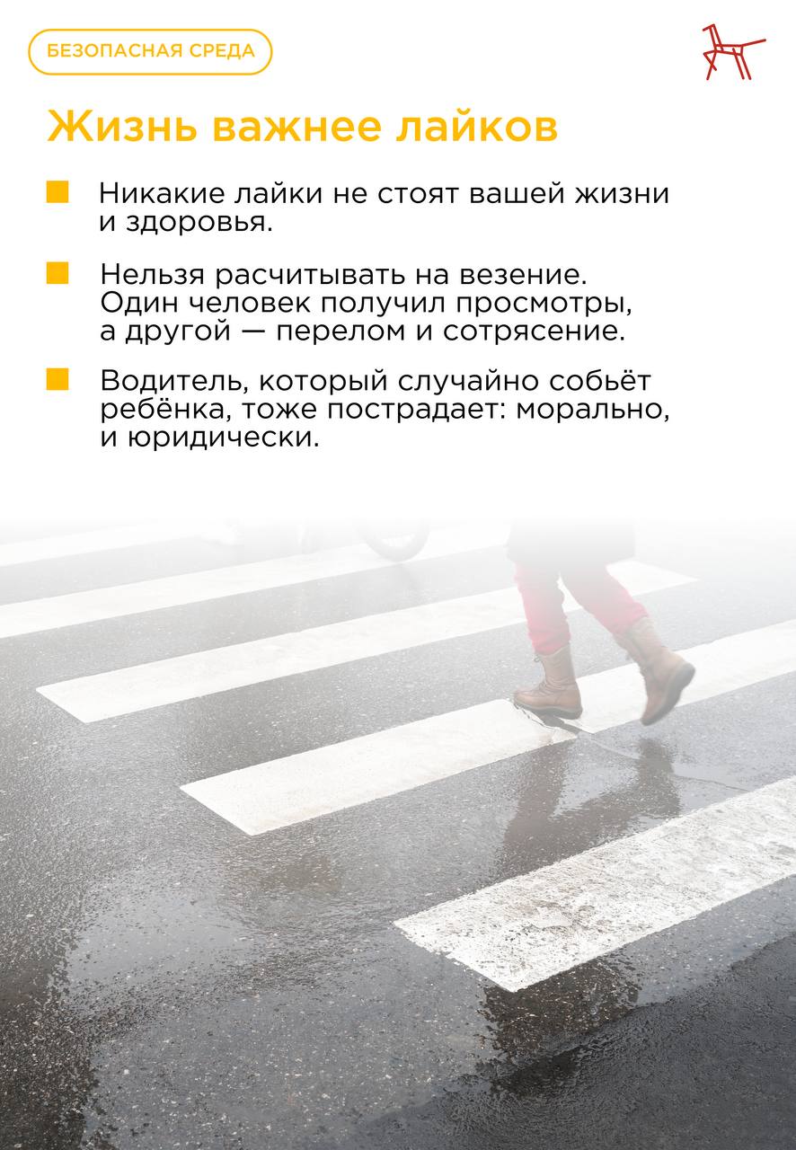 Кажется, что это просто весело, оригинально и набирает кучу просмотров. Но за кадром часто остаются больницы, слёзы родителей и даже уголовные дела. Сегодня в рубрике «Безопасная среда» говорим о том, почему нельзя повторять трюки из соцсетей, особенно если они связаны с дорогой. Даже если видео выглядит безобидно.
