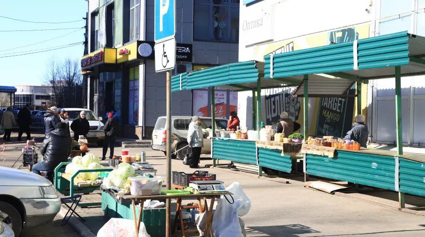 Прилавки, которые раньше были расположены сбоку здания, переместили ближе к главному входу. Самая большая проблема в том, что места там намного меньше. Вот и расселись торгующие, кто как мог. Кому не хватило прилавков, сделали их из лавочек и клумб.