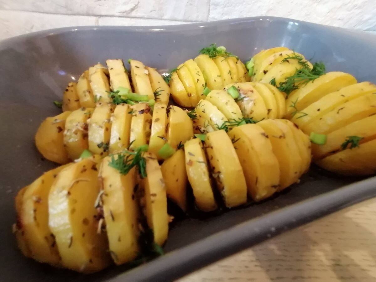 После этого следует смазать растительным маслом форму для запекания и аккуратно уложить туда подготовленную картошку. Установить форму в разогретую до 180°С духовку на минут 60. Когда время истечет, картошка будет готова: перед подачей на стол стоит посыпать блюдо свежей зеленью.