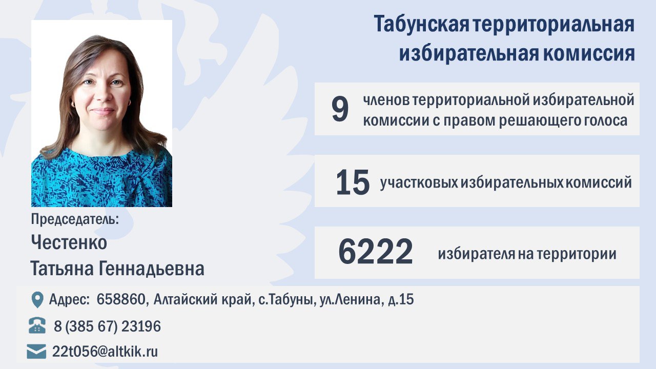 Председателем комиссии назначена Честенко Татьяна Геннадьевна, предложенная в состав комиссии Табунским районным Советом депутатов Алтайского края.