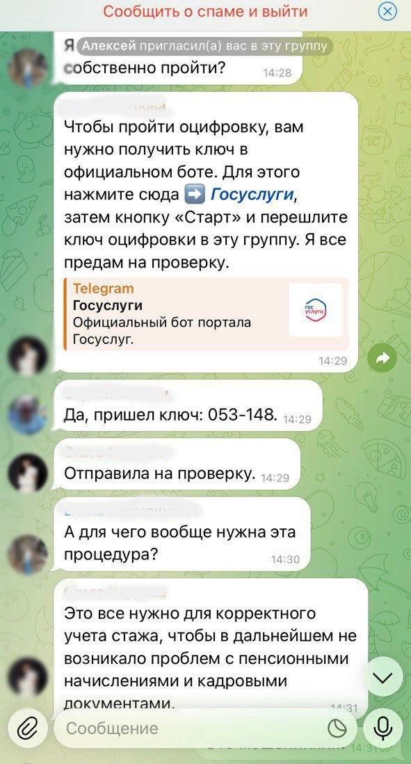 Мошенники создали группы, похожие на официальные, в одном из популярных мессенджеров. Затем написали сообщение якобы от имени руководства: «До конца текущего дня завершить оцифровку данных по следующим сотрудникам». Участникам группы предложили перейти в «официальный» бот, получить там код от портала «Госуслуги» и переслать его в группу.