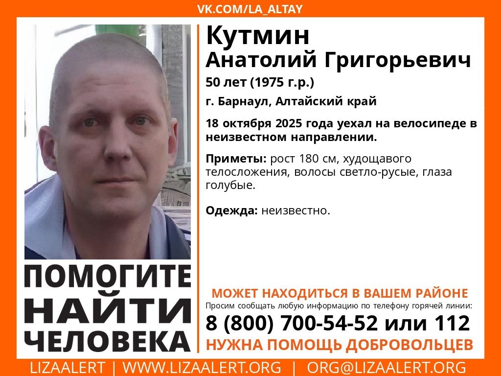 Родственники и волонтеры отряда "ЛизаАлерт" ищут 50-летнего барнаульца Анатолия Кутмина. 18 октября уехал на велосипеде в неизвестном направлении. С этого момента о его местоположении ничего не известно.