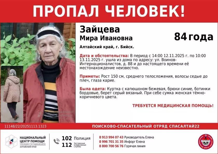 В период с 14:00 12 ноября по 10:00 13 ноября Мира Ивановна Зайцева ушла из дома по адресу ул. Воинов-Интернационалистов 88, и до настоящего времени её местонахождение неизвестно.