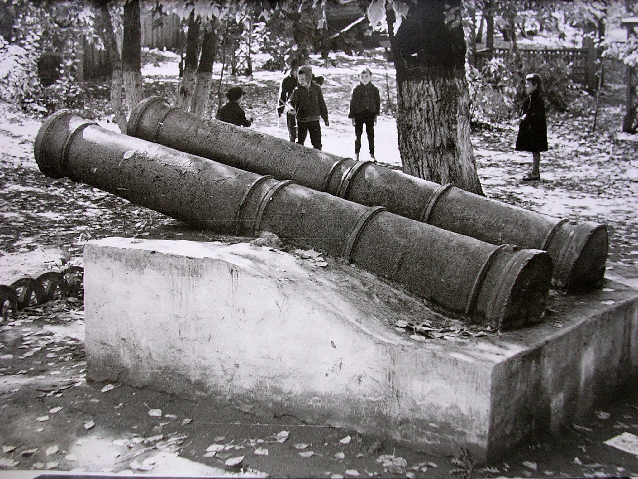 В 1909 году, когда город отмечал 200-летие Бикатунского острога, две пушки поднялись на специальный постамент — сначала кирпичный, позже гранитный. Именно пушки стали первым памятником Бийска.