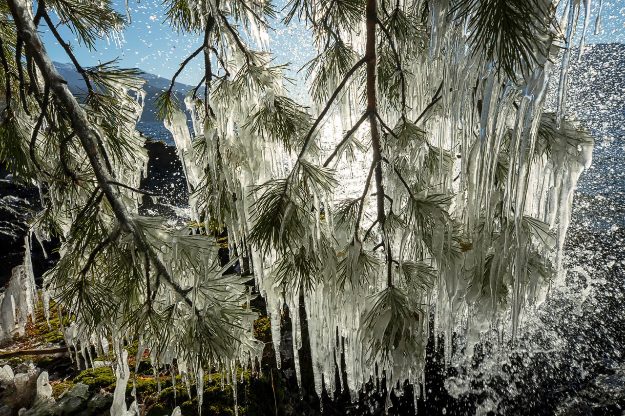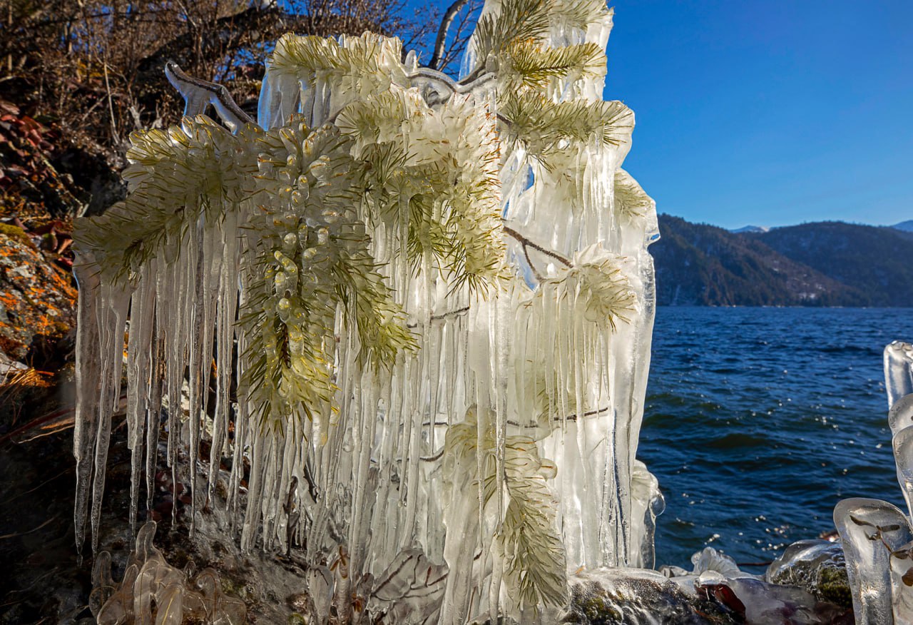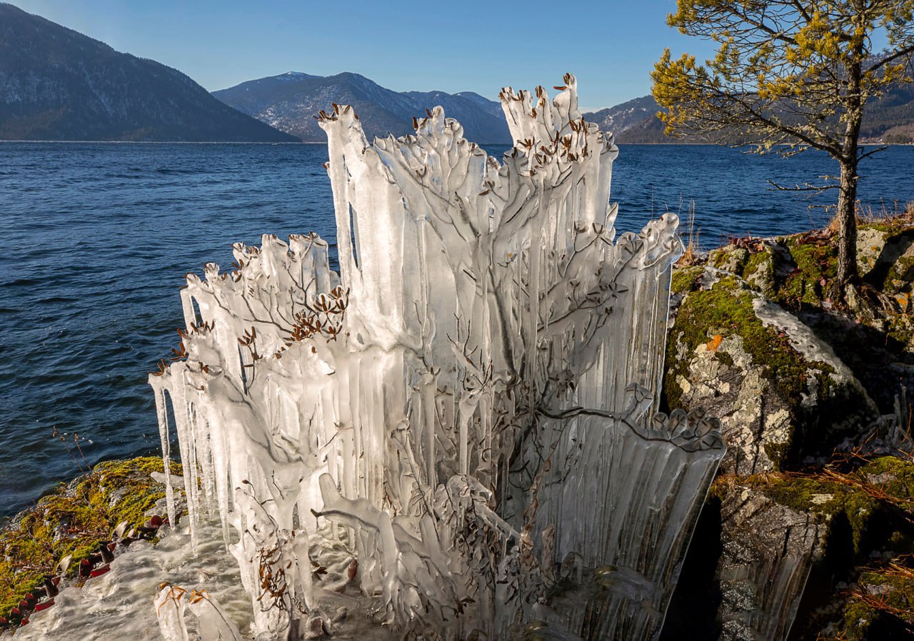 "Эта композиция по берегам озера образовалась после двух дней сильных "верховок". Следующие подобные виды, возможно, будут в декабре. Сейчас на Телецком морозы отступили и вернулось тепло поздней осени".