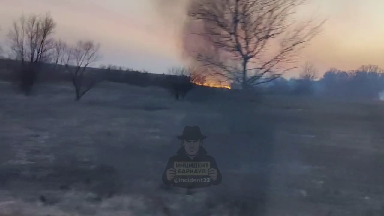 Горят поля около Поспелихи. Огонь перекидывается через трассу, сообщают подписчики «Инцидент Барнаул».