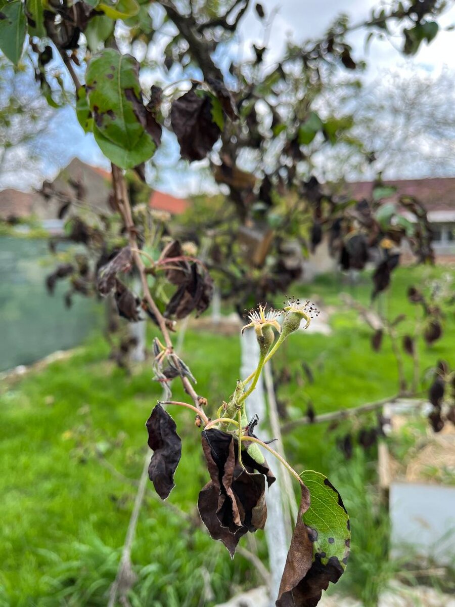 Весна 2025 года началась для груши обещающе: чистые листики, обильное цветение и множество завязей. Однако вскоре произошло резкое ухудшение состояния дерева. Через некоторое время появились признаки болезни: молодые листья стали чернеть и покрываться коричневыми пятнами. На данный момент, несмотря на некоторые улучшения, болезнь все еще дает о себе знать. Подозрения садовода касаются как бактериального ожога, так и других грибковых заболеваний, возможно, вызванных повышенной влажностью.