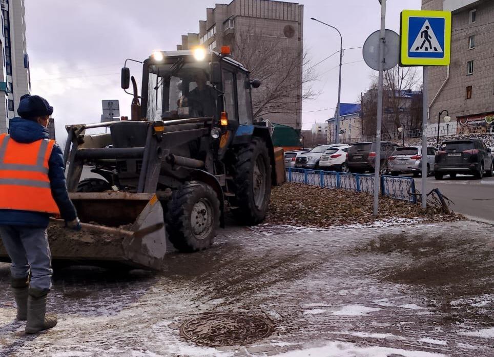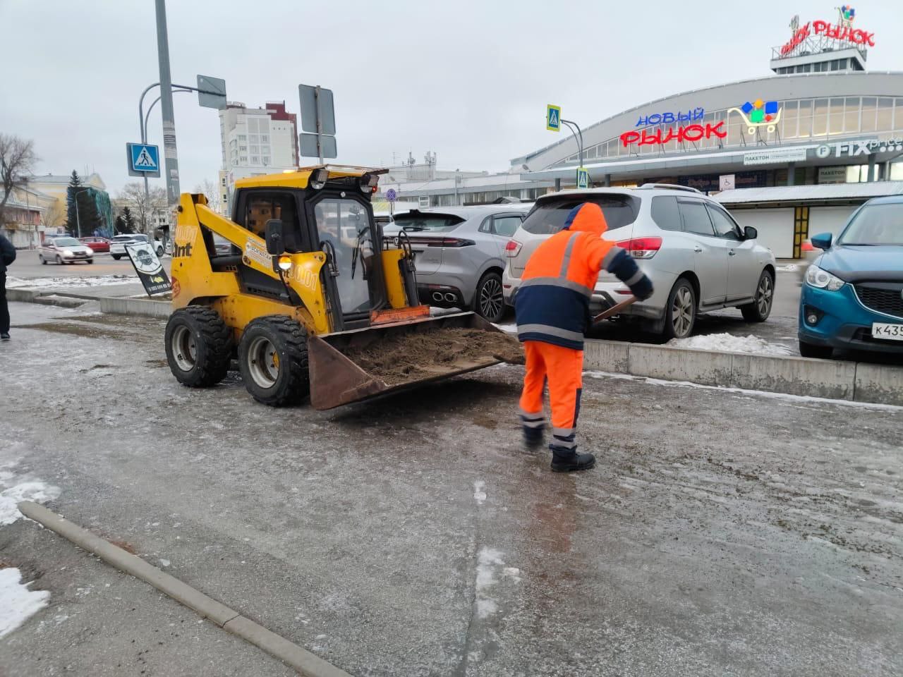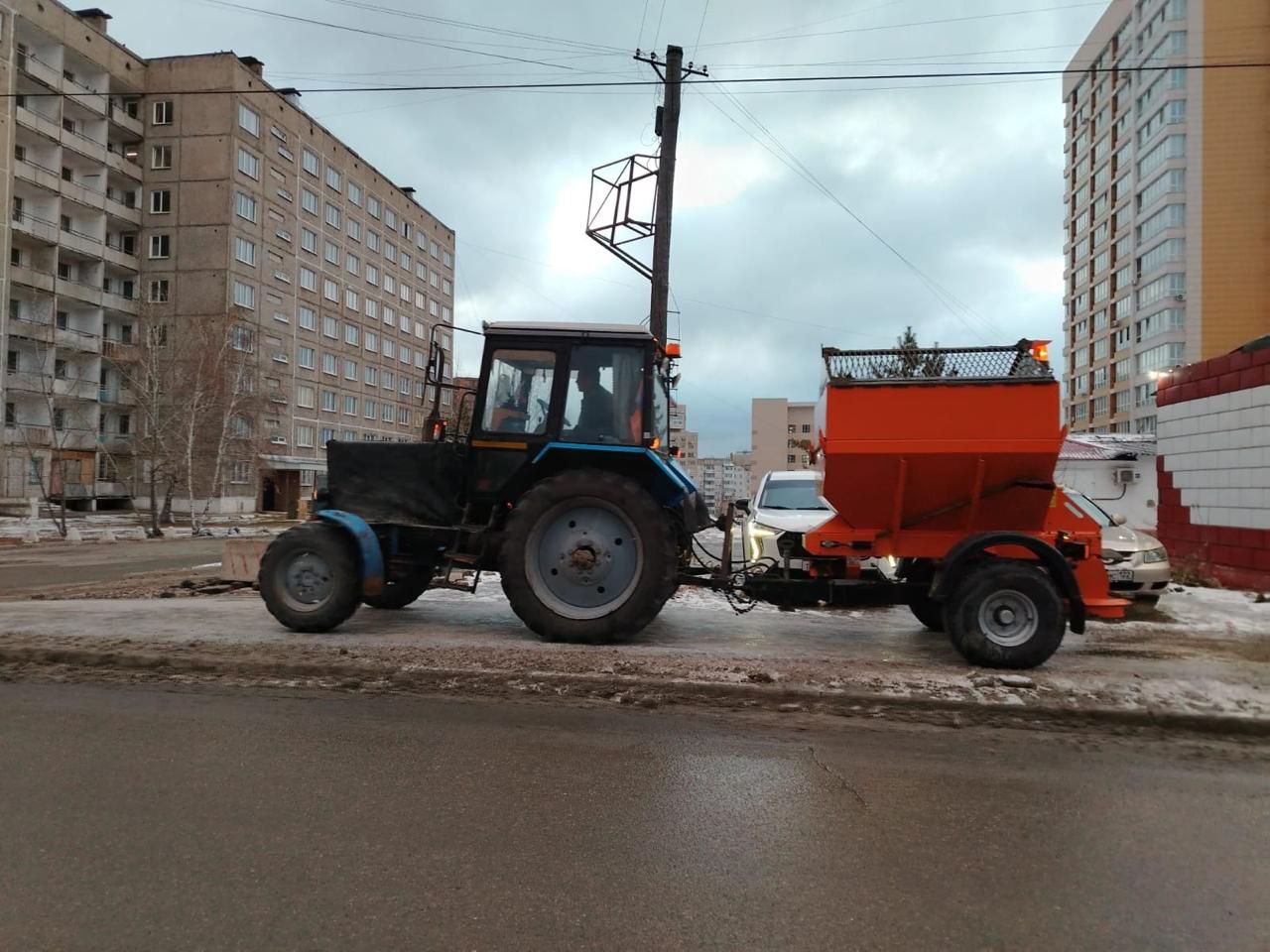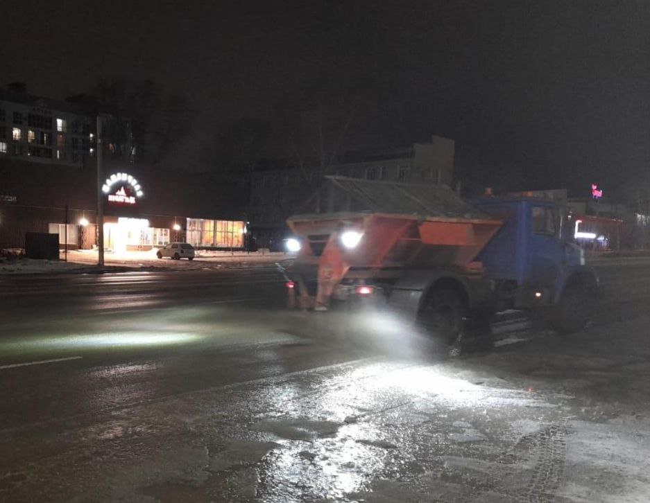 В связи с понижением температуры воздуха и прошедшими накануне обильными осадками в виде дождя и мокрого снега наблюдается подмерзание поверхностей дорог и тротуаров. Для безопасности передвижения транспорта и пешеходов дорожная служба проводит посыпку улично-дорожной сети.
