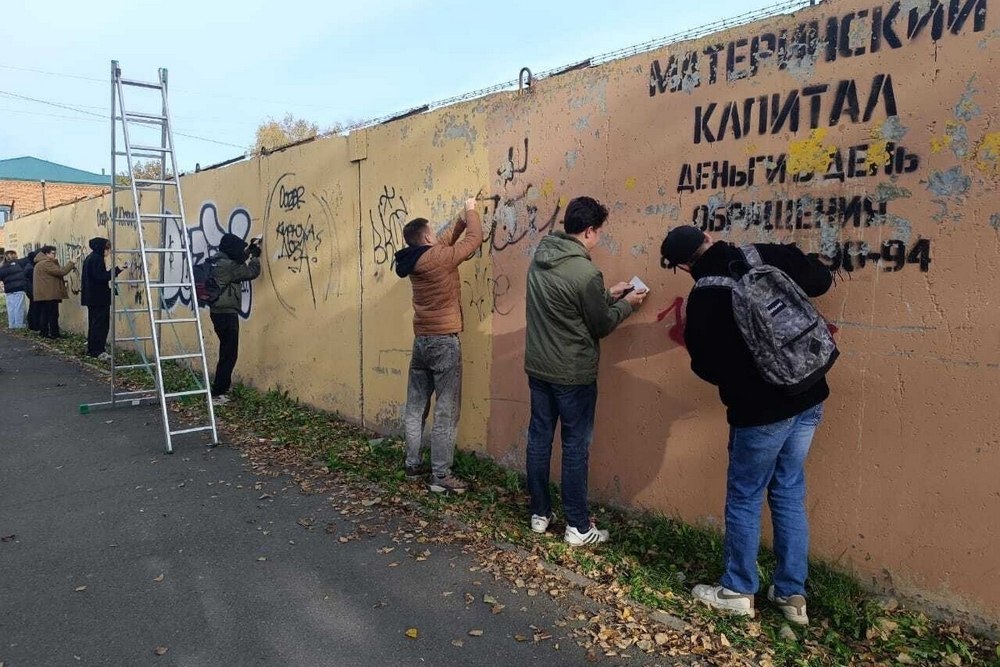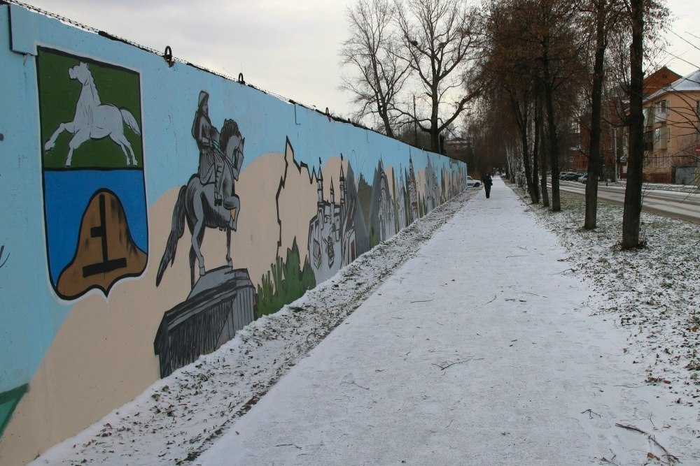 В старом центре Бийска завершилась реализация творческого проекта «Там, где мы!». Бетонное ограждение производственной территории на улице Льва Толстого преобразилось в масштабное художественное панно.