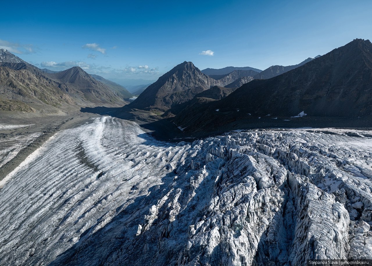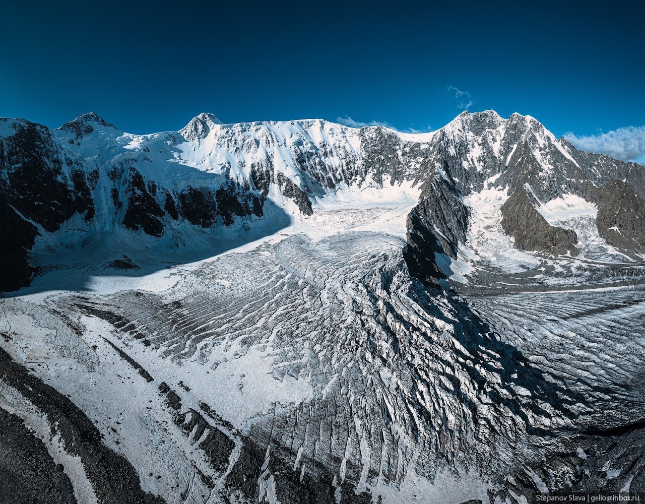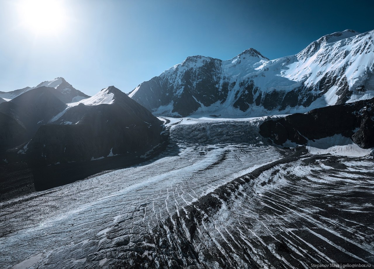 Аккемский ледник берет начало на склоне высочайшей горы Алтая — Белухи (4506 м).