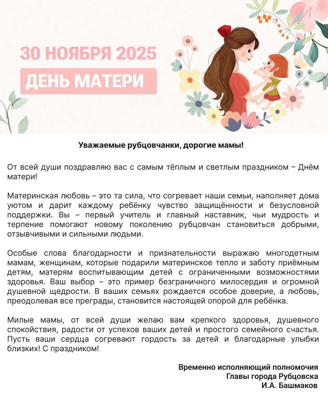 Поздравление временно исполняющего полномочия Главы города Рубцовска Игоря Башмакова с Днём матери