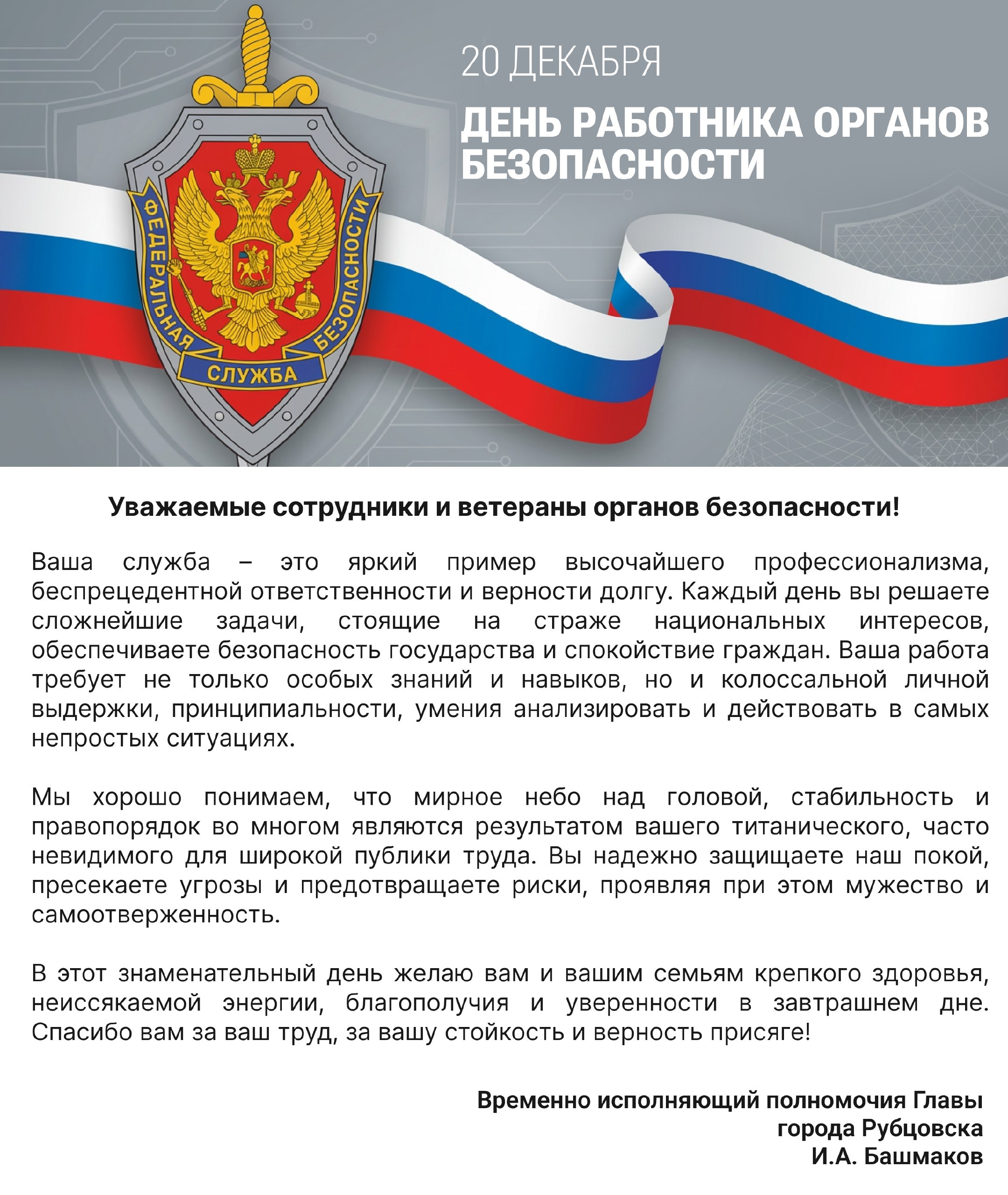Поздравление временно исполняющего полномочия Главы города Рубцовска Игоря Башмакова с Днём работника органов безопасности Российской Федерации.
