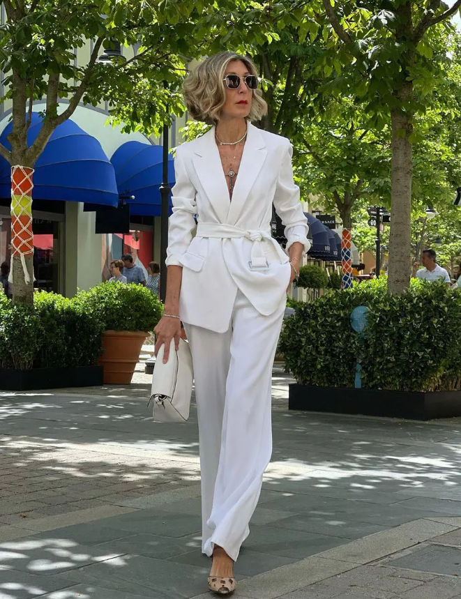 - Нежные оттенки белого: безусловно, белый цвет способен визуально освежить образ. Женщине за 60 стоит обратить внимание на белый брючный костюм. Светлые брюки и пиджак свободного кроя создают стильный, но при этом комфортный повседневный или бизнес-вариант.