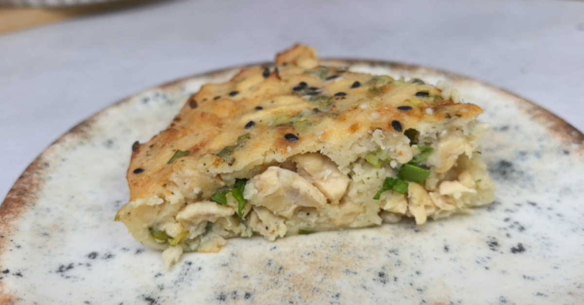 3. В готовую массу добавить обжаренное филе с луком и нарезанный зеленый лук. Вылить в форму, посыпать кунжутом, если хочется, и выпекать в разогретой духовке 35-45 минут до золотистой корочки. После выпекания дать немного остыть, чтобы насладиться теплым и ароматным пирогом!