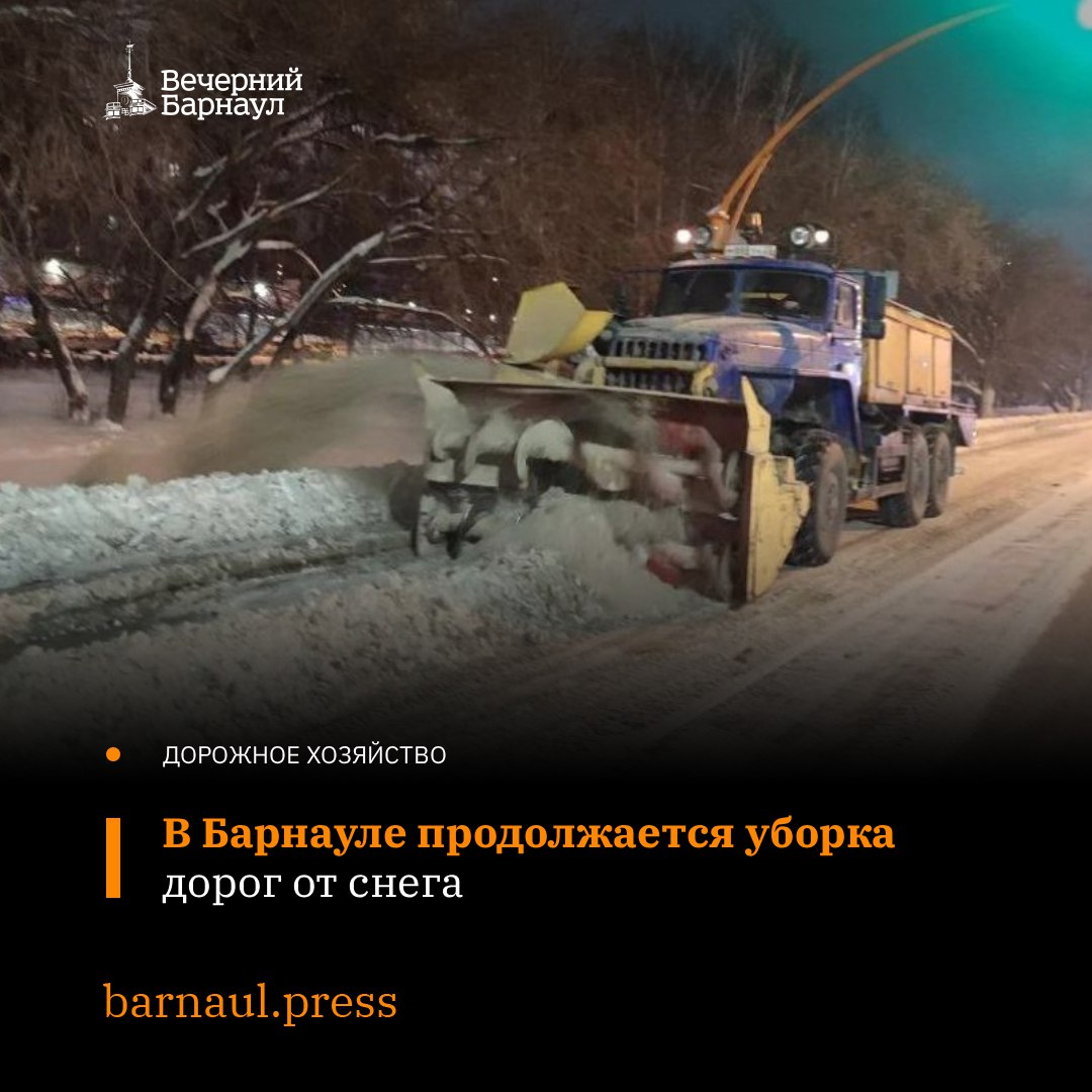 Механизированную очистку автодорог провели на улицах Ленинградской, Панфиловцев, Энтузиастов, Сухэ-Батора, Георгиева, 50 лет СССР, Шумакова, Советской Армии, Транзитной, Заринской, Бабуркина, Автотранспортной, 65 лет Победы, 280-летия Барнаула, Северо-Западной, а также на других участках.