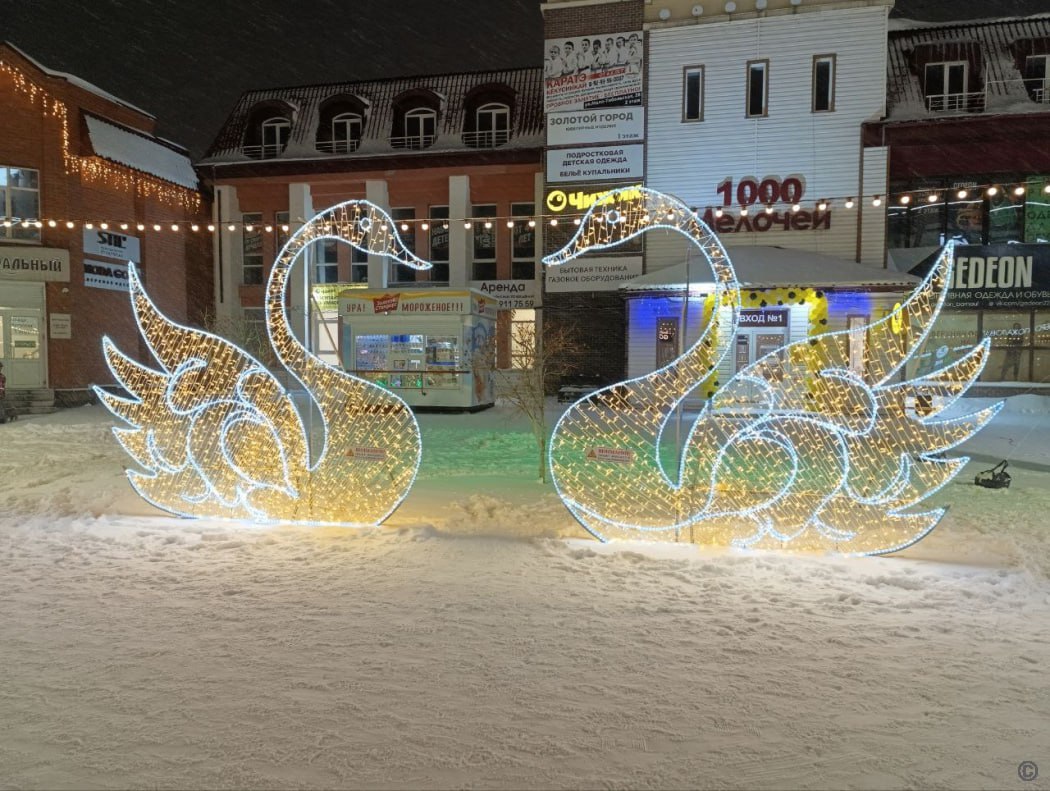 На улице установили шестиметровую искусственную ель, прогулочную зону украсили гирляндами, светящимися елями, шарами, цветами, световыми фигурами «Лебеди», «Бабочка» и «Звезда».