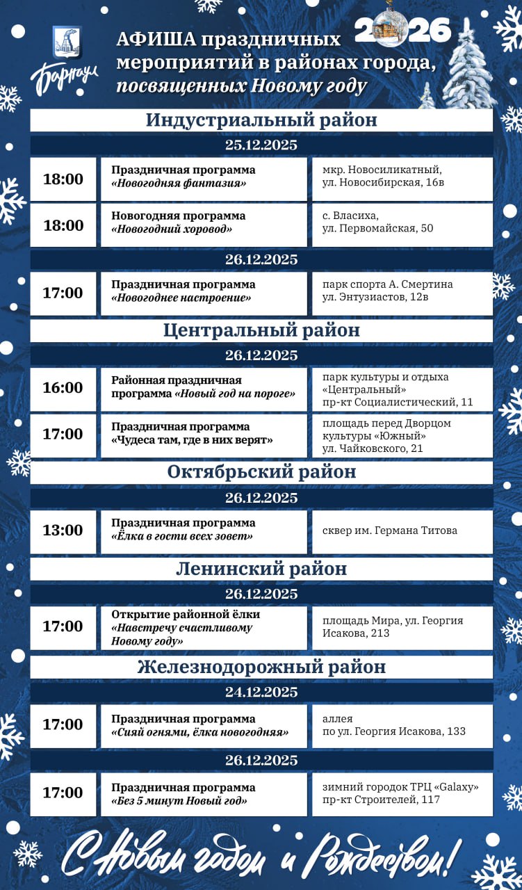 В субботу, 26 декабря, в 17.00 состоится открытие главной городской елки на площади Свободы. Зрителям будет представлена новогодняя шоу-программа «Здравствуй, новый год». В мероприятии примут участие творческие коллективы города, профессиональные артисты Алтайского государственного музыкального театра. Зрителей также ожидают барабанное шоу с пиротехническим эффектом от коллектива «Джуманджи» и поздравление Деда Мороза и снегурочки.