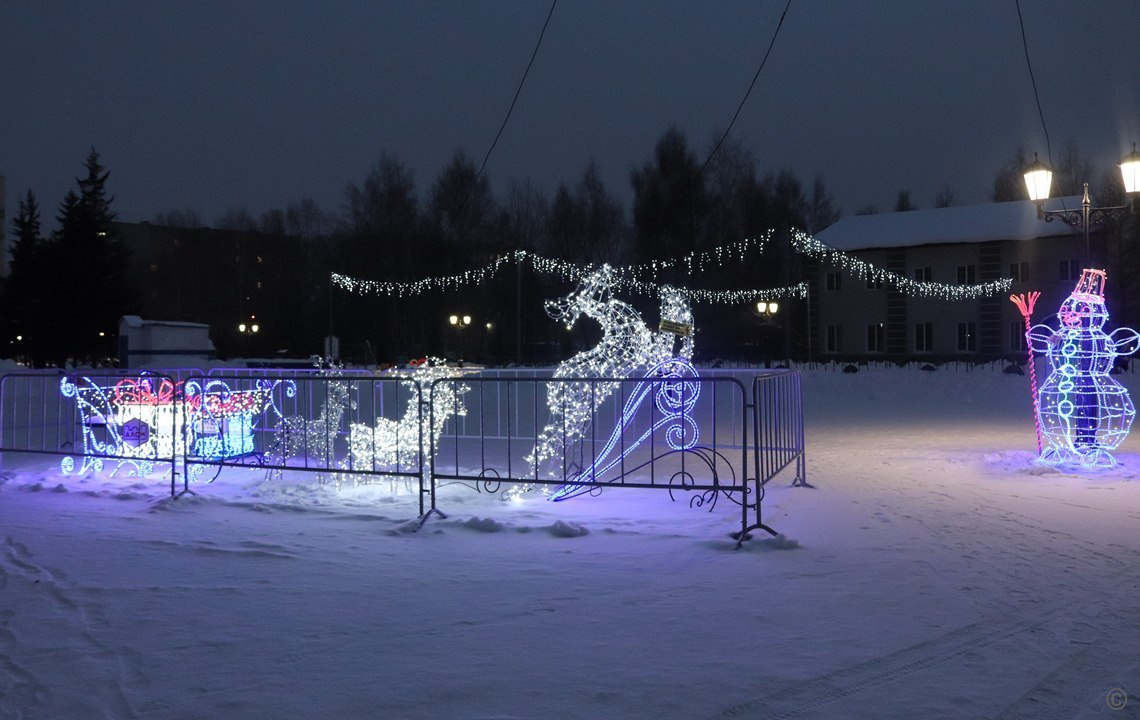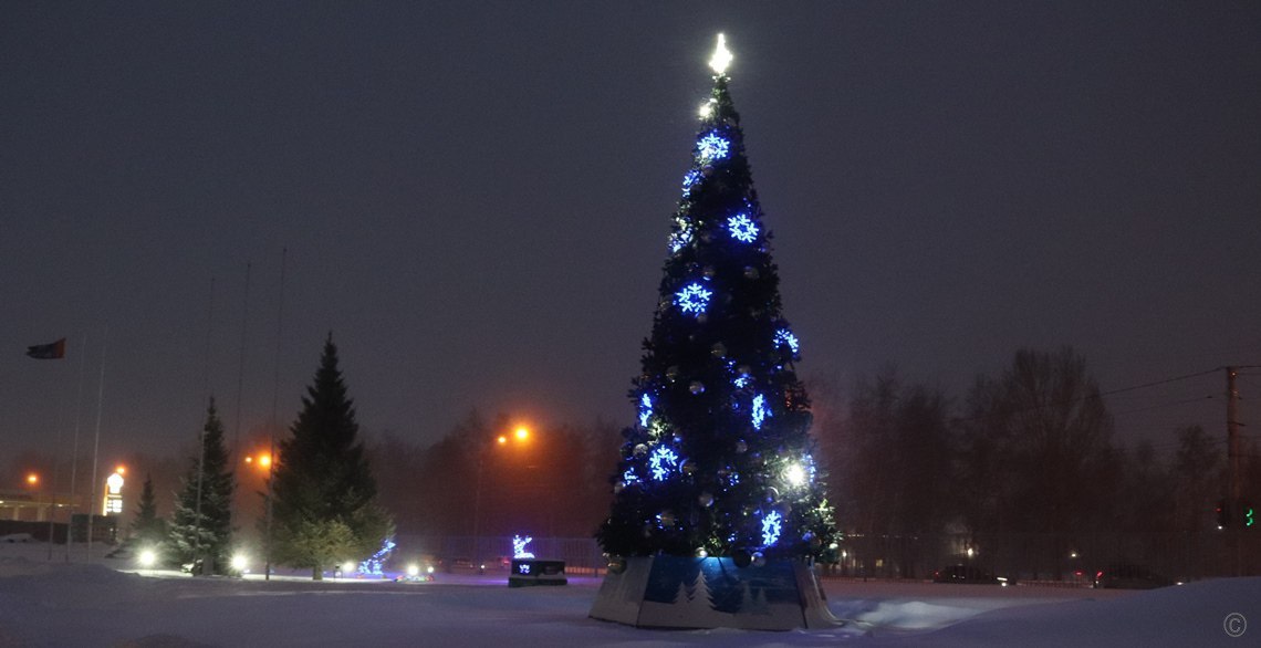 На главной площадке Ленинского района — площади Мира — появилась 12-метровая искусственная ель, на её ограждении разместили баннеры, смонтировали световой потолок, установили разные световые фигуры. Посмотрите, как красиво!