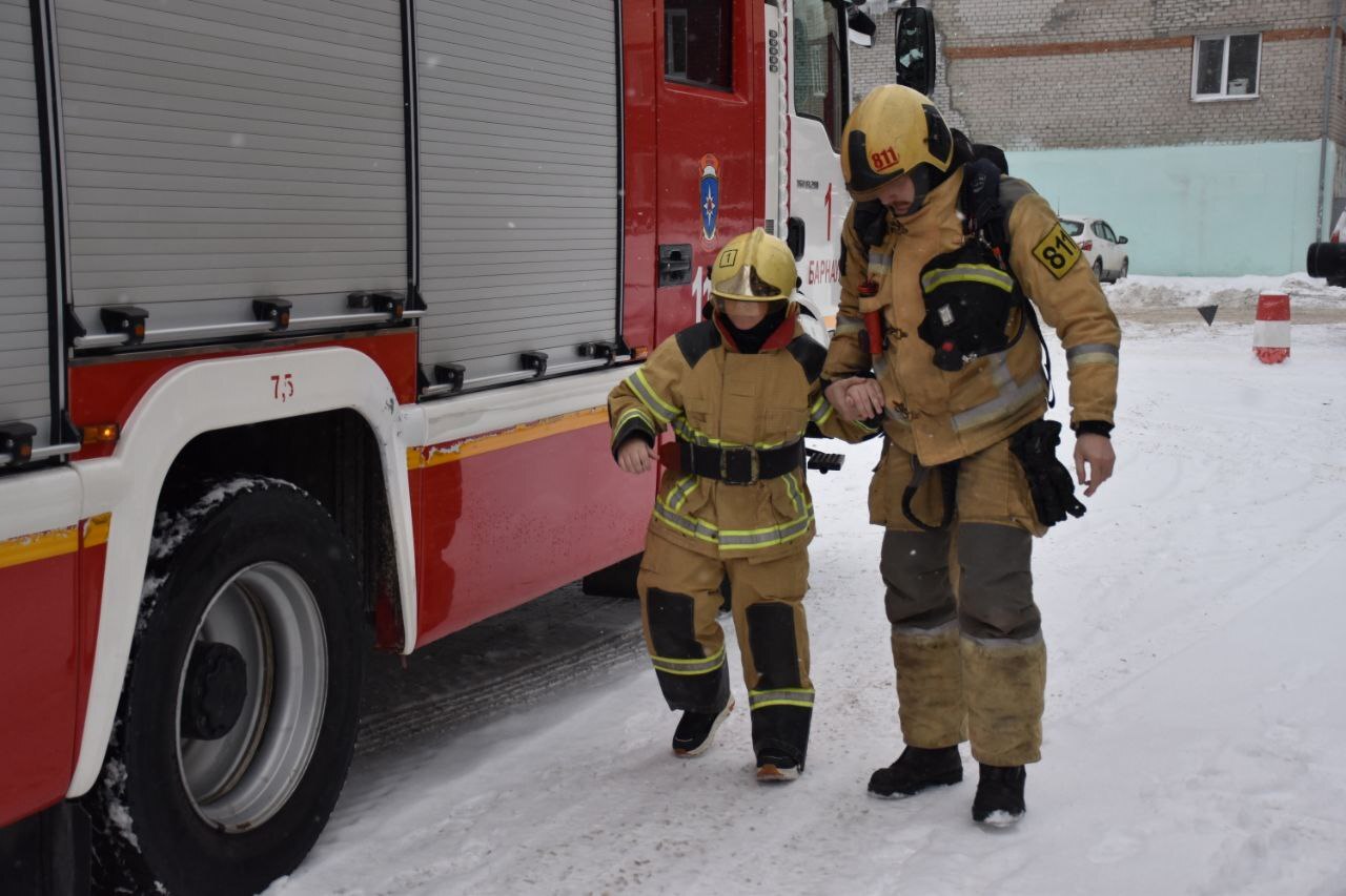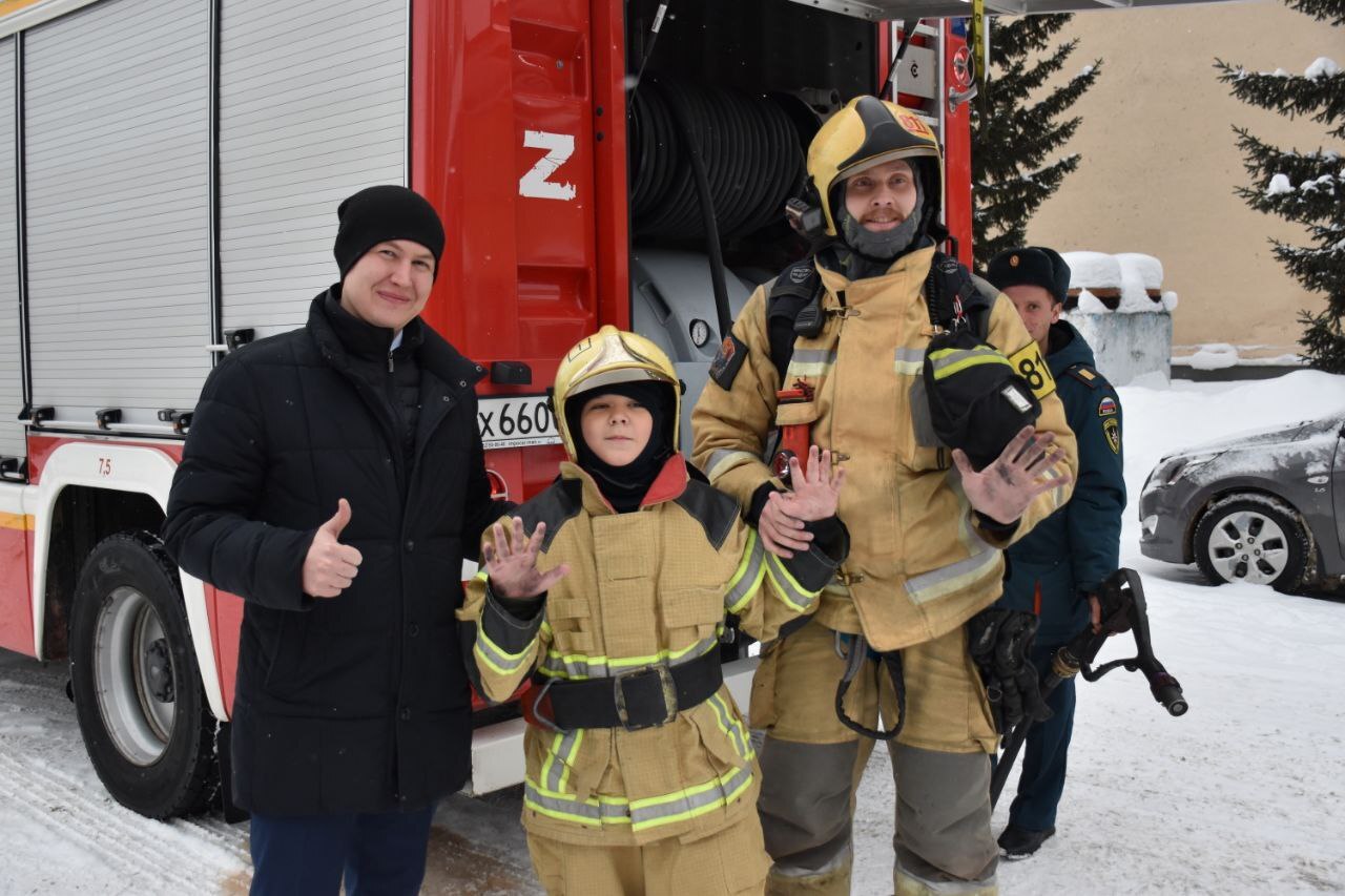 Затем перешли в Пожарно-спасательную часть №1. Степана познакомили с устройством пожарной машины, рассказали о каждом из отсеков и даже поделились секретами мастерства. А главное, помогли почувствовать себя настоящим спасателем: переодели в форму, прокатили на машине и дали «затушить» условное возгорание.