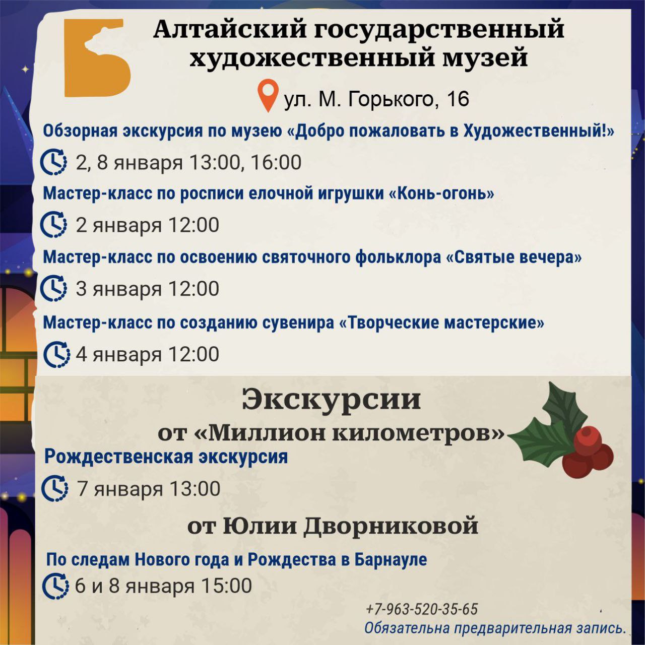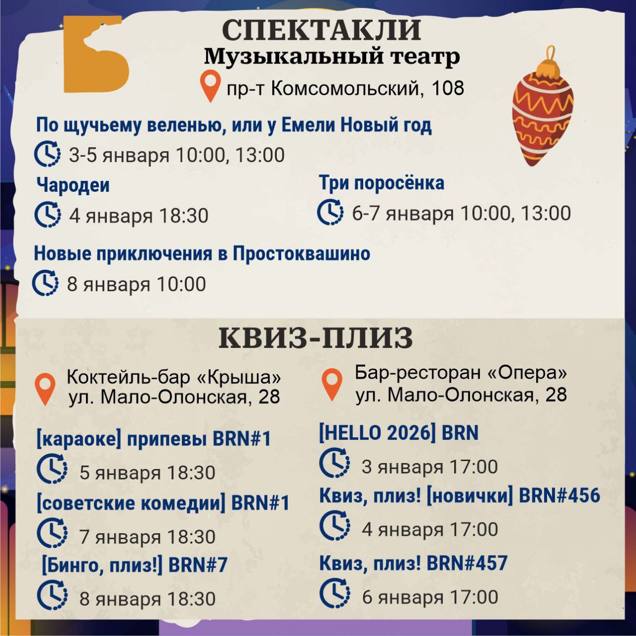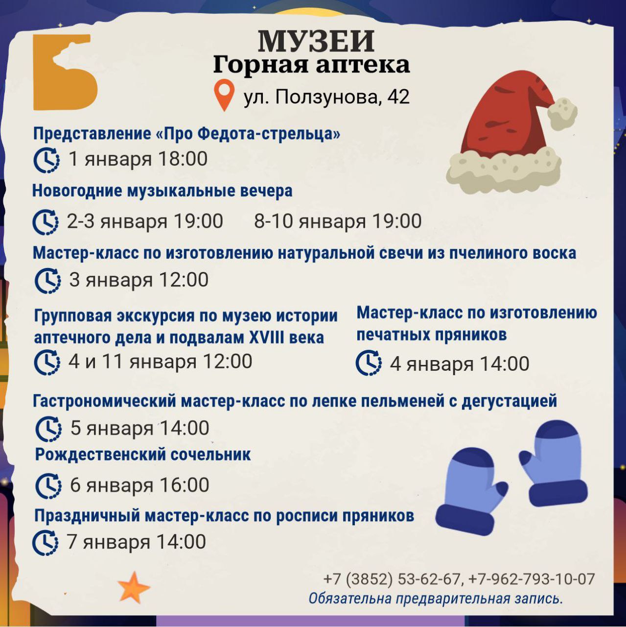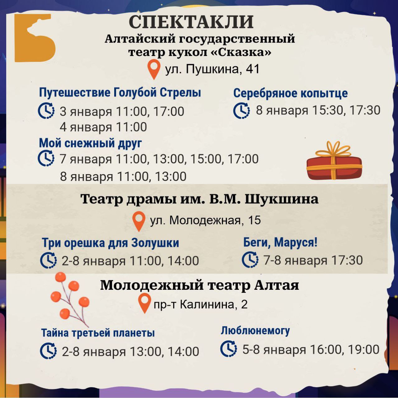В преддверии Нового года предлагаем жителям и гостям города разнообразную программу развлечений и культурных мероприятий в новогодние и рождественские праздники!
