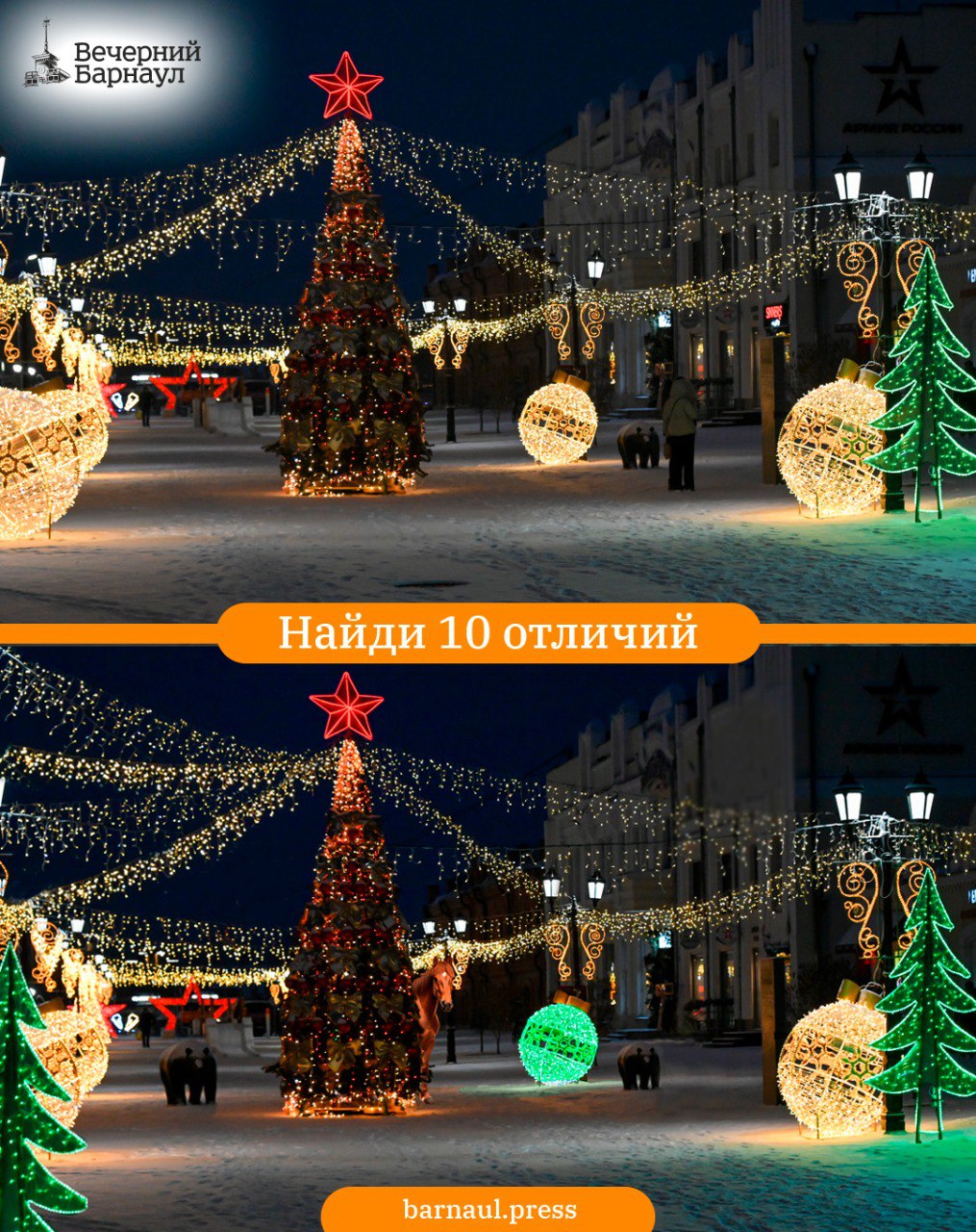 Чтобы ваши новогодние каникулы стали ещё ярче, приглашаем вас принять участие в нашей традиционной игре. Найдите 10 отличий на фотографиях любимого Барнаула.