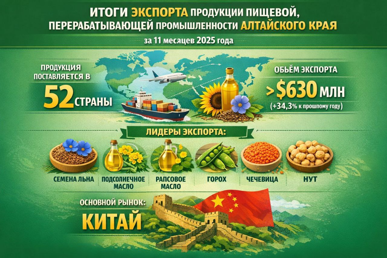 Экспорт: продукция поставляется в 52 страны, объём – более $630 млн (+34,3% к прошлому году). Лидеры экспорта: семена льна, подсолнечное и рапсовое масла, горох, чечевица, нут. Основной рынок – Китай.