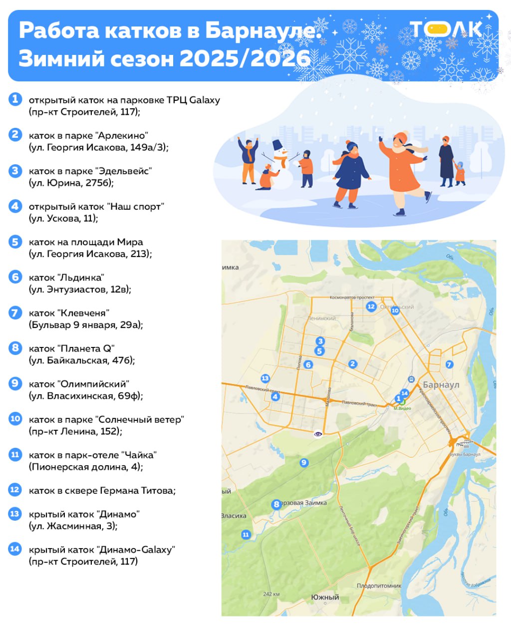 Давайте проведем остаток дней активно. Решили напомнить, где можно покататься на коньках в Барнауле. Выбираем удобную локацию и отправляемся получать хорошее настроение на свежем воздухе. Напомним, что в парке "Изумрудный" также работает каток на пруду.