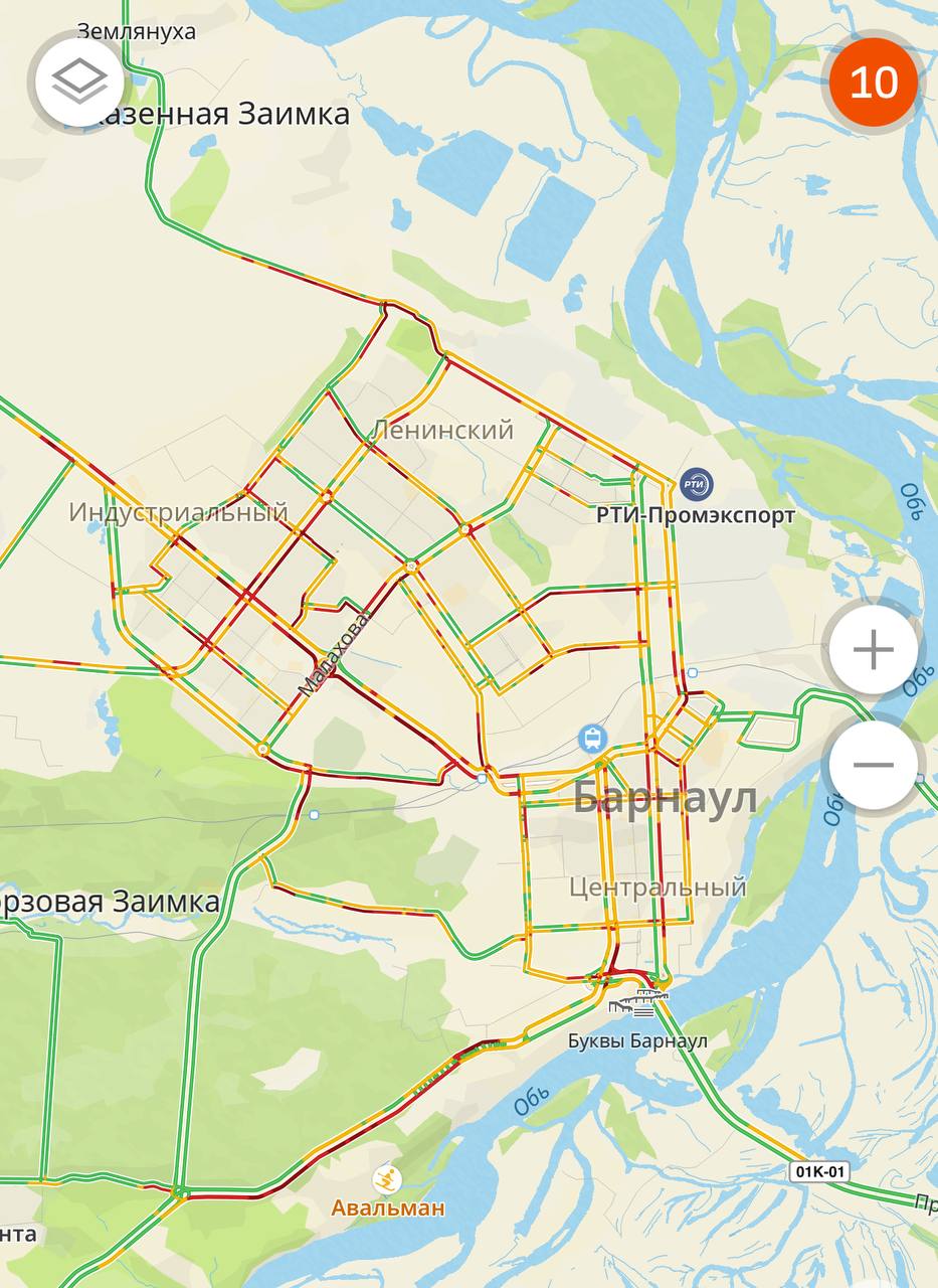 В 10-балльных пробках утром 13 января стоит весь Барнаул и подъезды к нему.