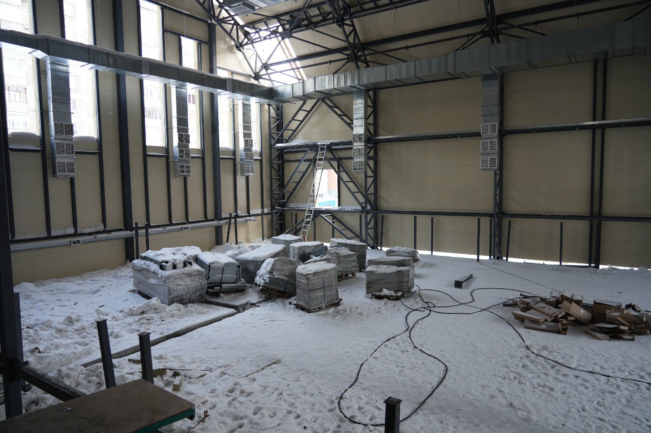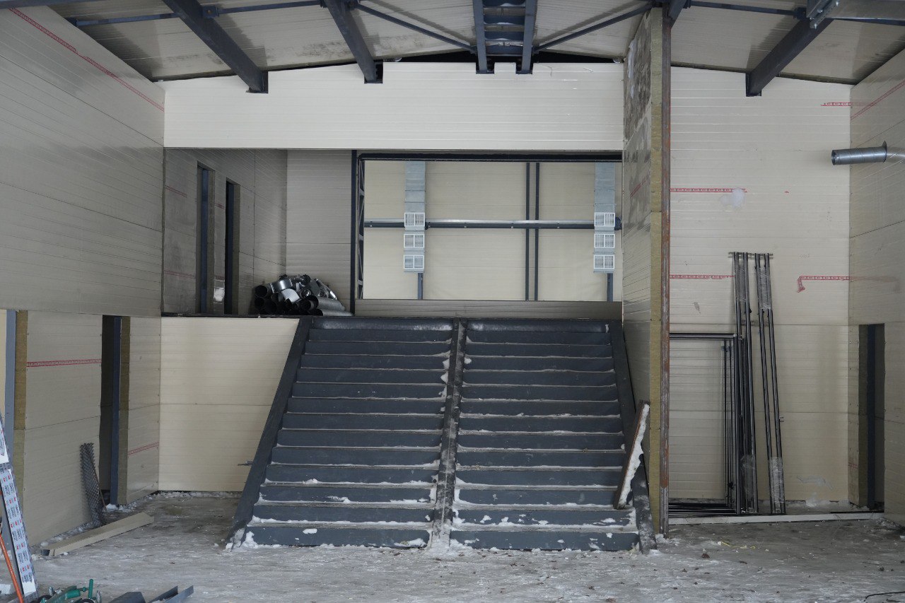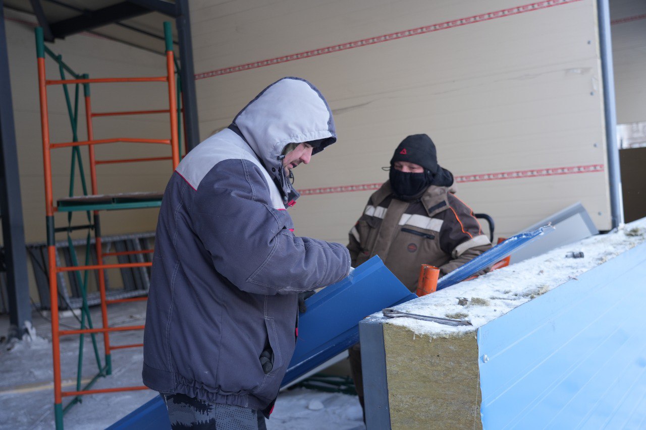 Сейчас специалисты занимаются монтажом оконных и дверных блоков, фасонных элементов здания, устройством системы отопления и системы внутреннего электроснабжения.