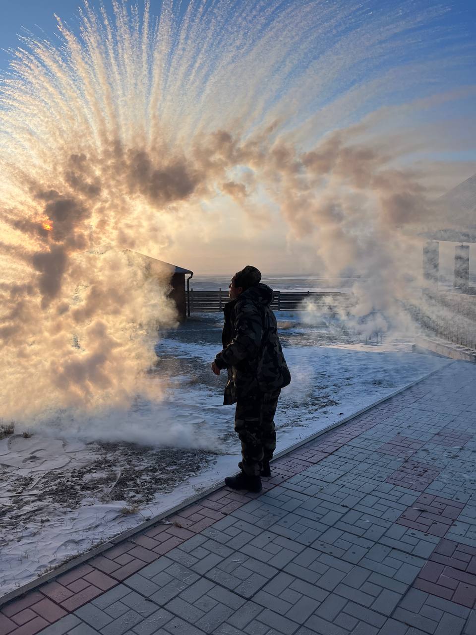 В Кош-Агачском районе температура опустилась до 50°C, в Горно-Алтайске – до 34°C. Сотрудник парка Эркин Тадыров показал народную забаву с кипятком на морозе.