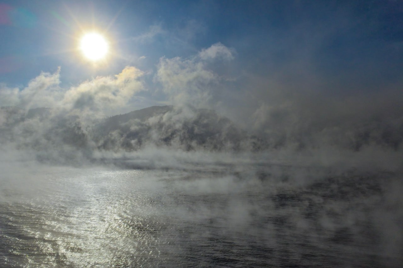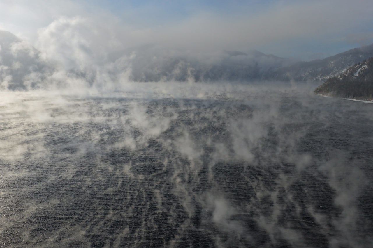 "Вода, хранящая летнее тепло, встречается с арктическим холодом, и начинается магия: интенсивное испарение, которое видно невооруженным глазом. Обычно, чтобы явление стало заметным, столбик термометра должен опуститься ниже 16-18° и чем больше температурная разница, тем интенсивнее протекает процесс испарения и тем плотнее туман", — поделились сотрудники Алтайского заповедника Роман и Татьяна Воробьёвы.