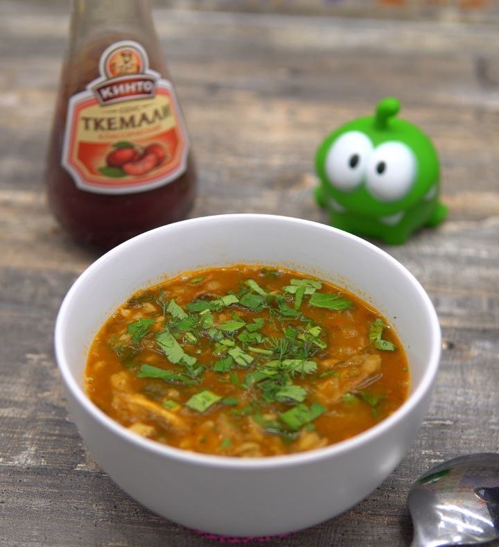 В завершение в суп вводят 100 г соуса ткемали, который и придаёт блюду характерную кислинку. Варят до полной готовности риса, а затем сервируют горячим, щедро посыпав свежей зеленью и дополнительно подавая с хлебом или лепёшками.