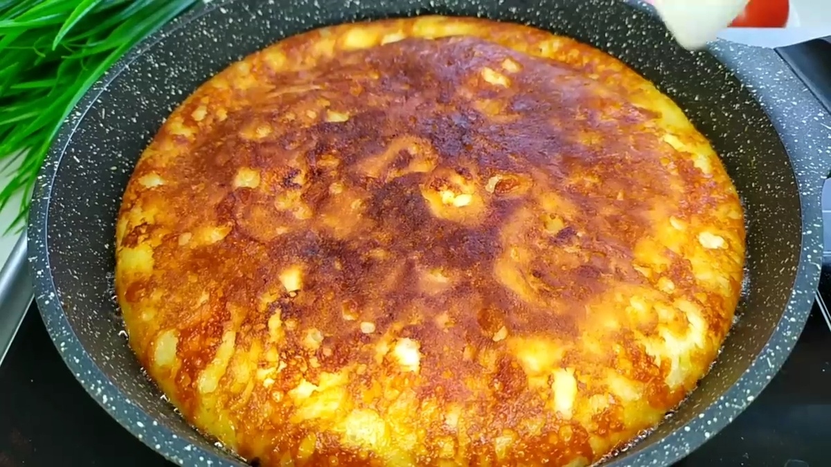Разогрейте сковороду на среднем огне и добавьте кусочек сливочного масла. Когда масло растопится, осторожно вылейте подготовленное тесто. Запекайте лепешку под крышкой в течение 10 минут на минимальном огне, следя за тем, чтобы она не пригорела. Затем переверните её и готовьте ещё 10 минут, также под крышкой.