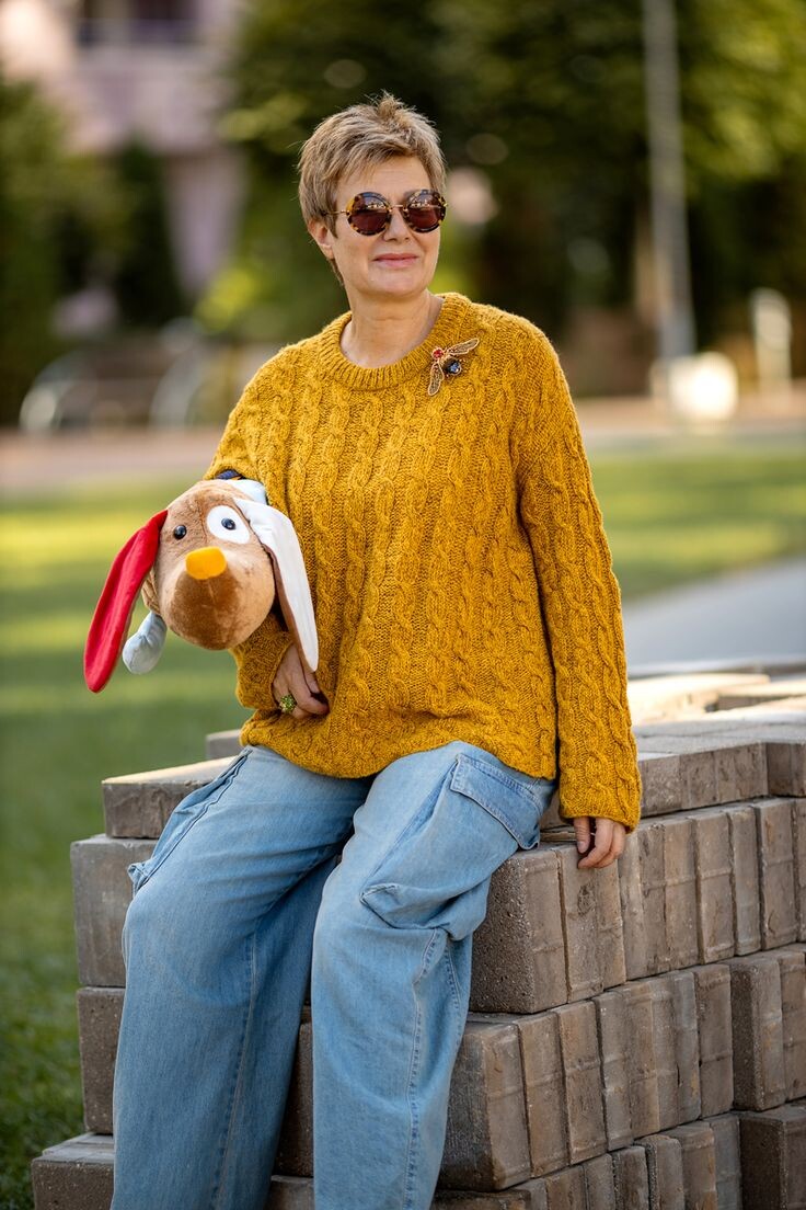 Горчичный джемпер — изящный и свободный, отлично подойдет для повседневных образов. Он гармонирует со светло-голубыми джинсами, добавляя изящества и легкости.