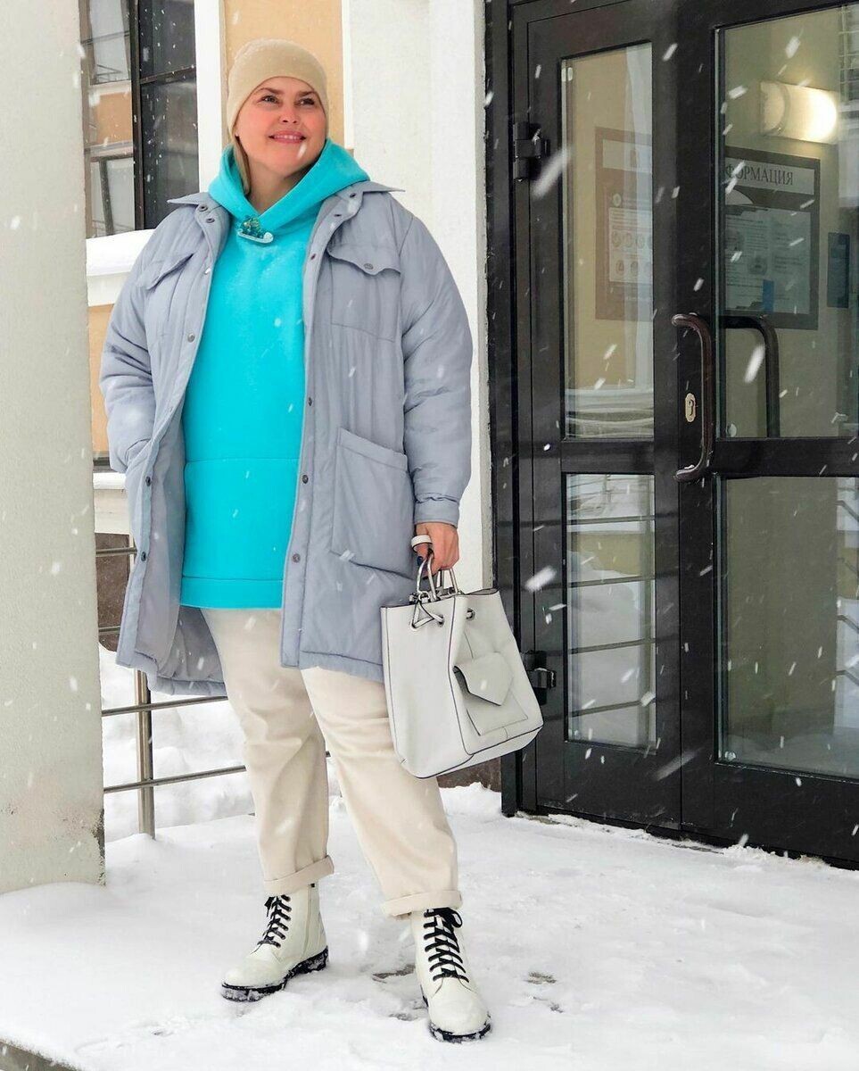 - Прямые белые брюки и толстовка: Комбинирование умиротворяющего голубого оттенка с белыми брюками создаст эффектный ансамбль. Светло-серая куртка с накладными карманами дополнит образ и визуально стройнит фигуру. Ярко-белая обувь с черной шнуровкой удачно завершает наряд.