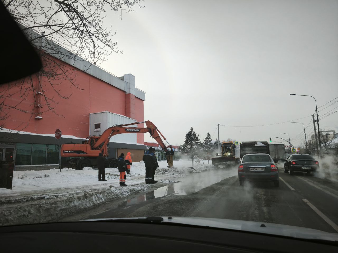 Проводятся земляные работы из-за прорыва водопровода. Ориентировочное время устранения повреждения 20:30.