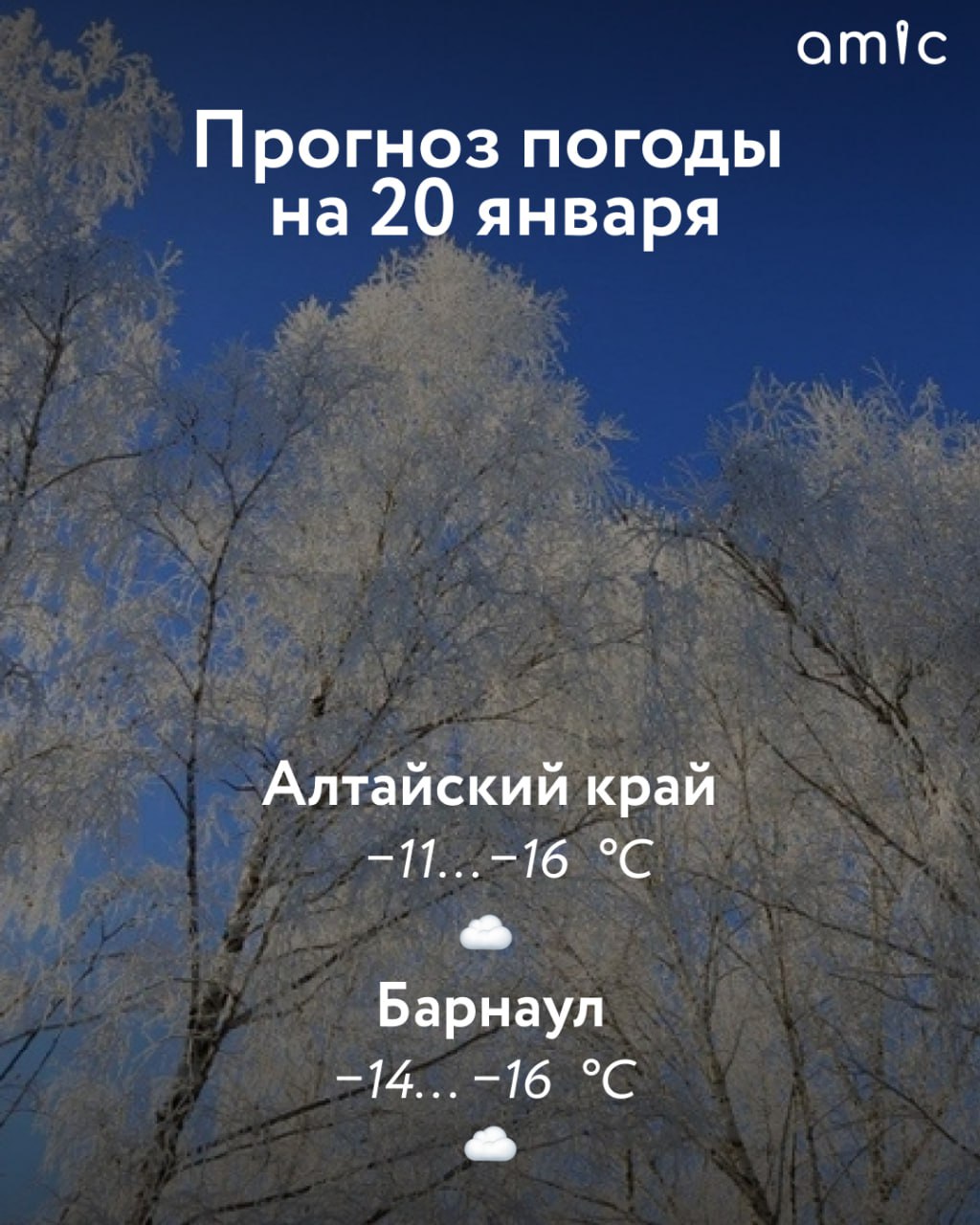 От -11 до -16 градусов ожидается в Алтайском крае 20 января. Такой прогноз сделали синоптики регионального Гидрометцентра.