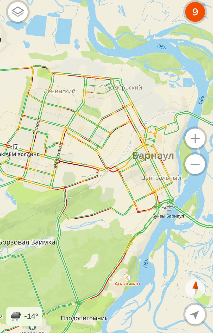 9 баллов — практически все главные дороги Барнаула утром 21 января в заторах.
