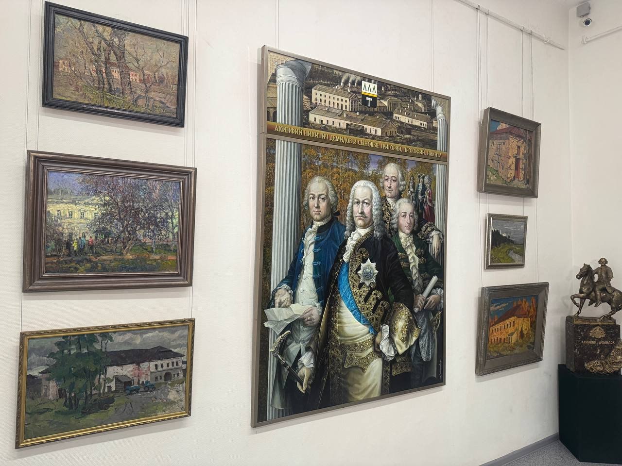 В экспозиции 47 произведений живописи, графики, скульптуры, декоративно-прикладного искусства из коллекции музея, мастерских художников, музея «Мир времени». Центральной работой экспозиции является монументальное живописное полотно Александра Емельянова «Акинфий Никитич Демидов и сыновья: Григорий, Прокофий, Никита».