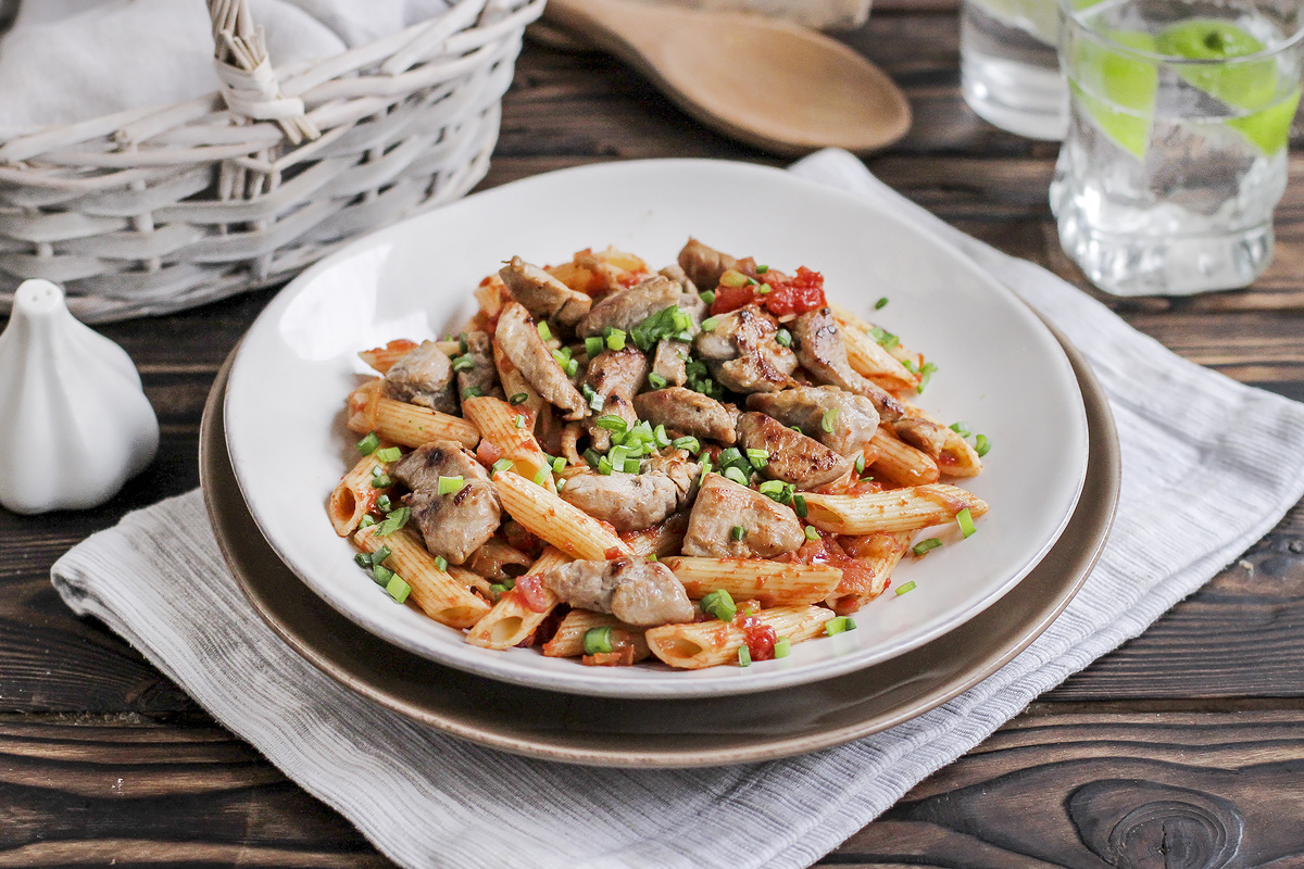 Шаг 1: Вскипятите 2 литра воды в кастрюле, добавьте соль. Высыпьте пенне и варите на сильном огне 8-9 минут. Слейте воду, поставьте обратно в кастрюлю, перемешайте с растительным маслом, чтобы предотвратить слипание. Пока варится паста, разогрейте сковороду с 1 ст. ложкой растительного масла. Свинину посолите и поперчите, чеснок нарежьте мелко. Обжаривайте свинину с чесноком на сильном огне 3-4 минуты, затем убавьте огонь и готовьте еще 5-7 минут до полной готовности. Выложите свинину на тарелку.
